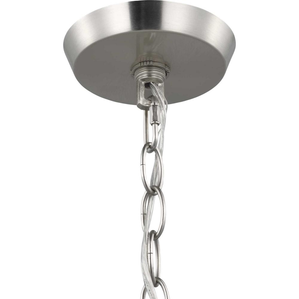 The chandelier is finished in a lovely brushed nickel