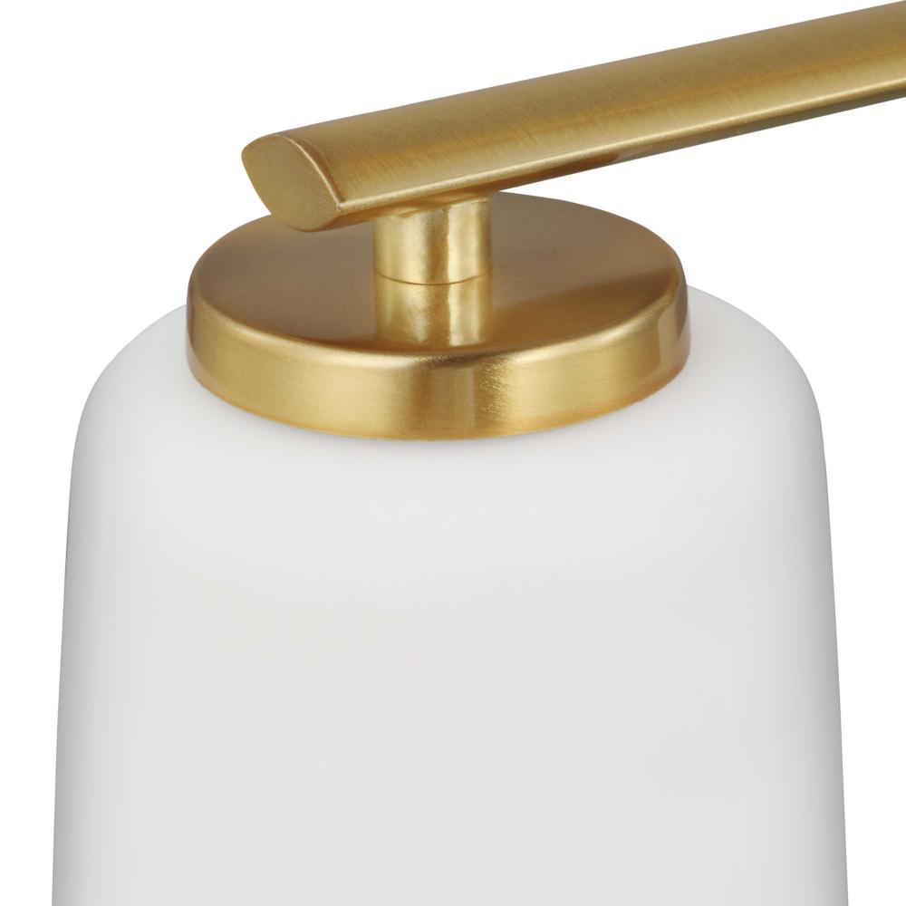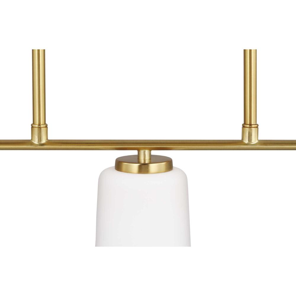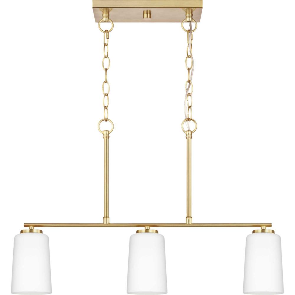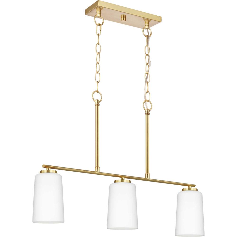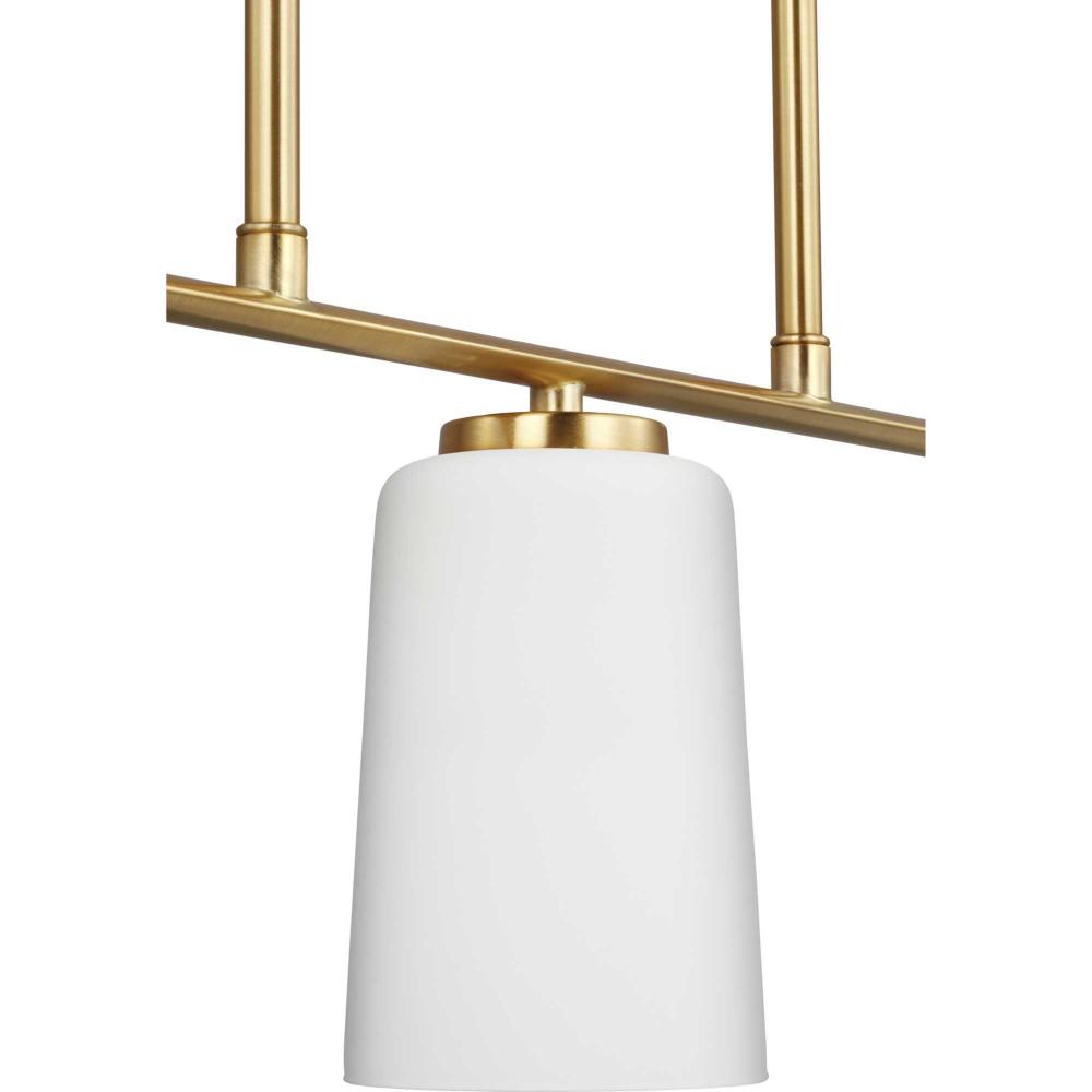 Fundamentally modern but with a traditional twist, the Adley linear chandelier combines etched white glass shades with simple, straight bars finished in satin brass. This light is an elegant choice for illuminating kitchen, bars and dining rooms in transitional settings and contemporary settings. The fixture has 48 in. of chain to customize it for a variety of ceiling heights and can be used on a sloped ceiling.
