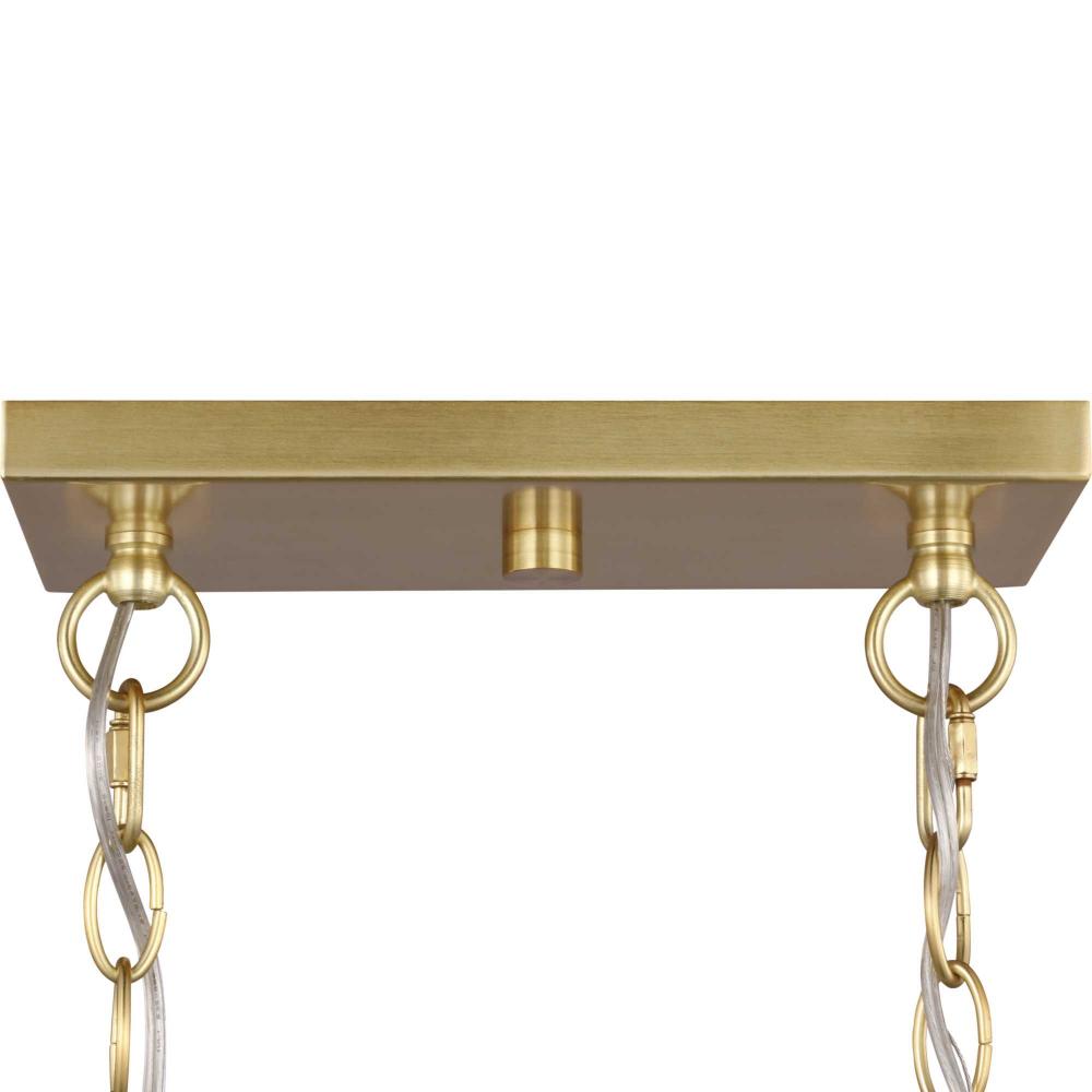 The linear chandelier is coated in a sophisticated satin brass finish