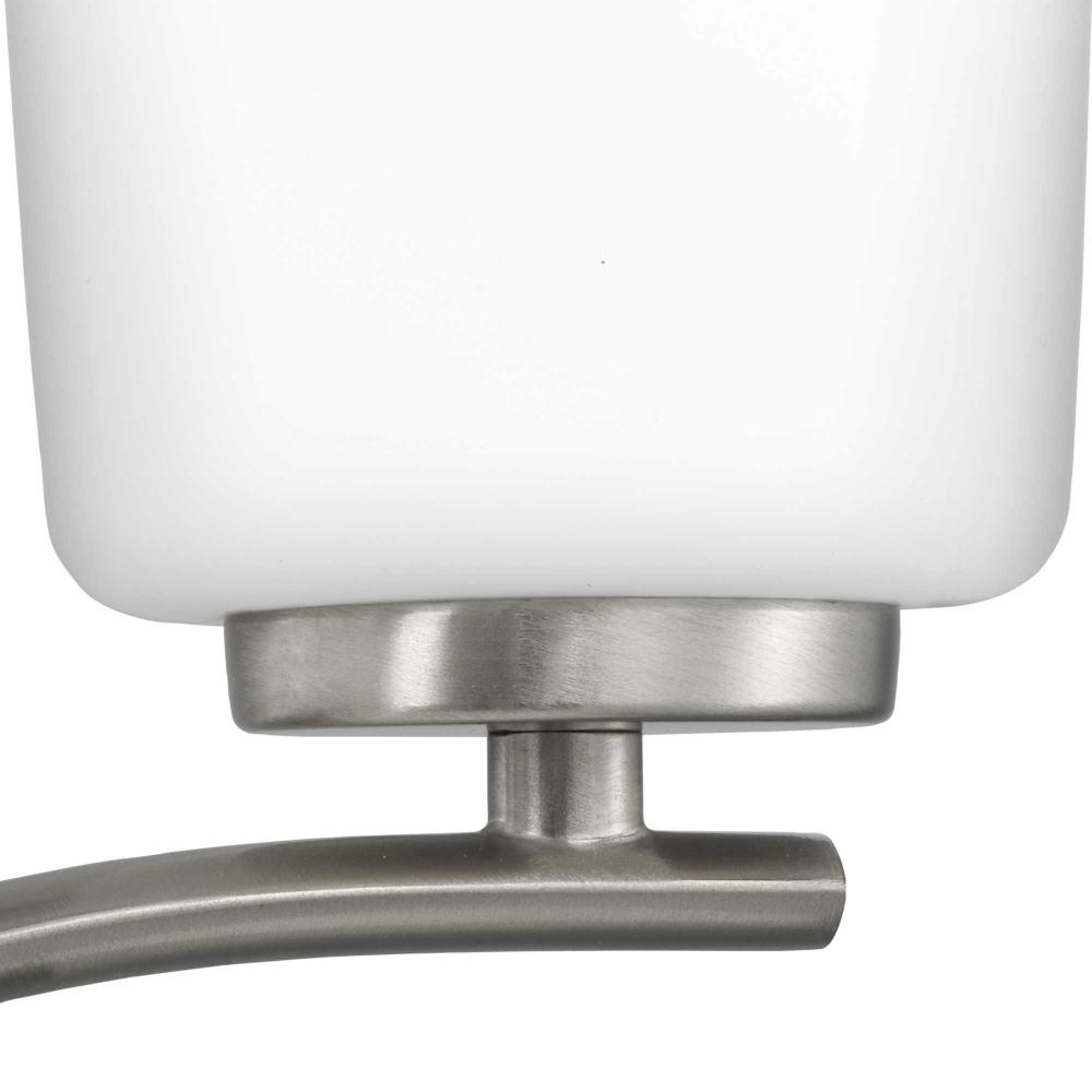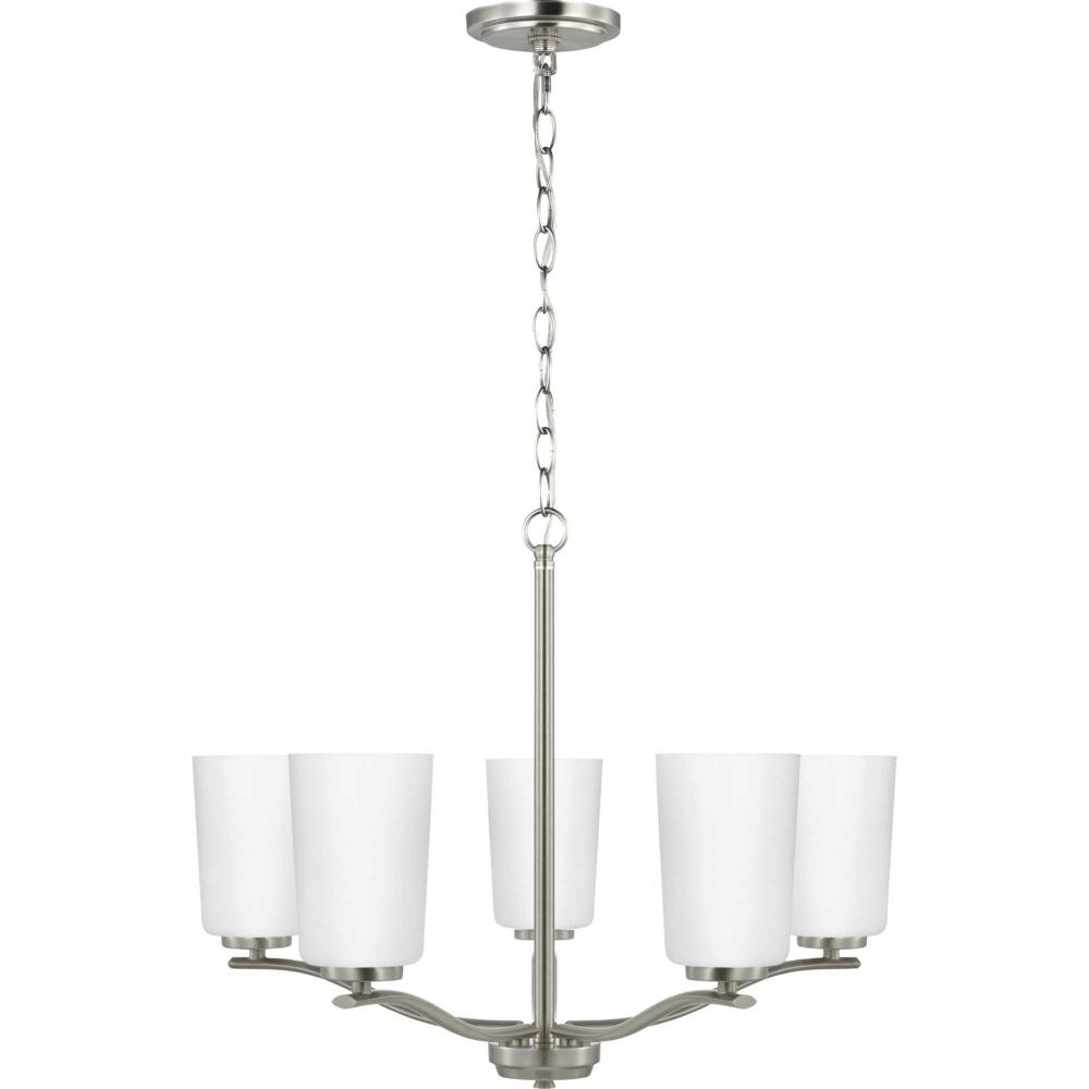 Fundamentally modern but with a traditional twist, the Adley chandelier combines etched white glass shades with a curved arms and simple, straight bars finished in brushed nickel. This light is an elegant choice for illuminating dining rooms, halls and home theaters or bedrooms in transitional settings and contemporary settings. The fixture has 48 in. of chain to customize it for a variety of ceiling heights and can be used on a sloped ceiling.