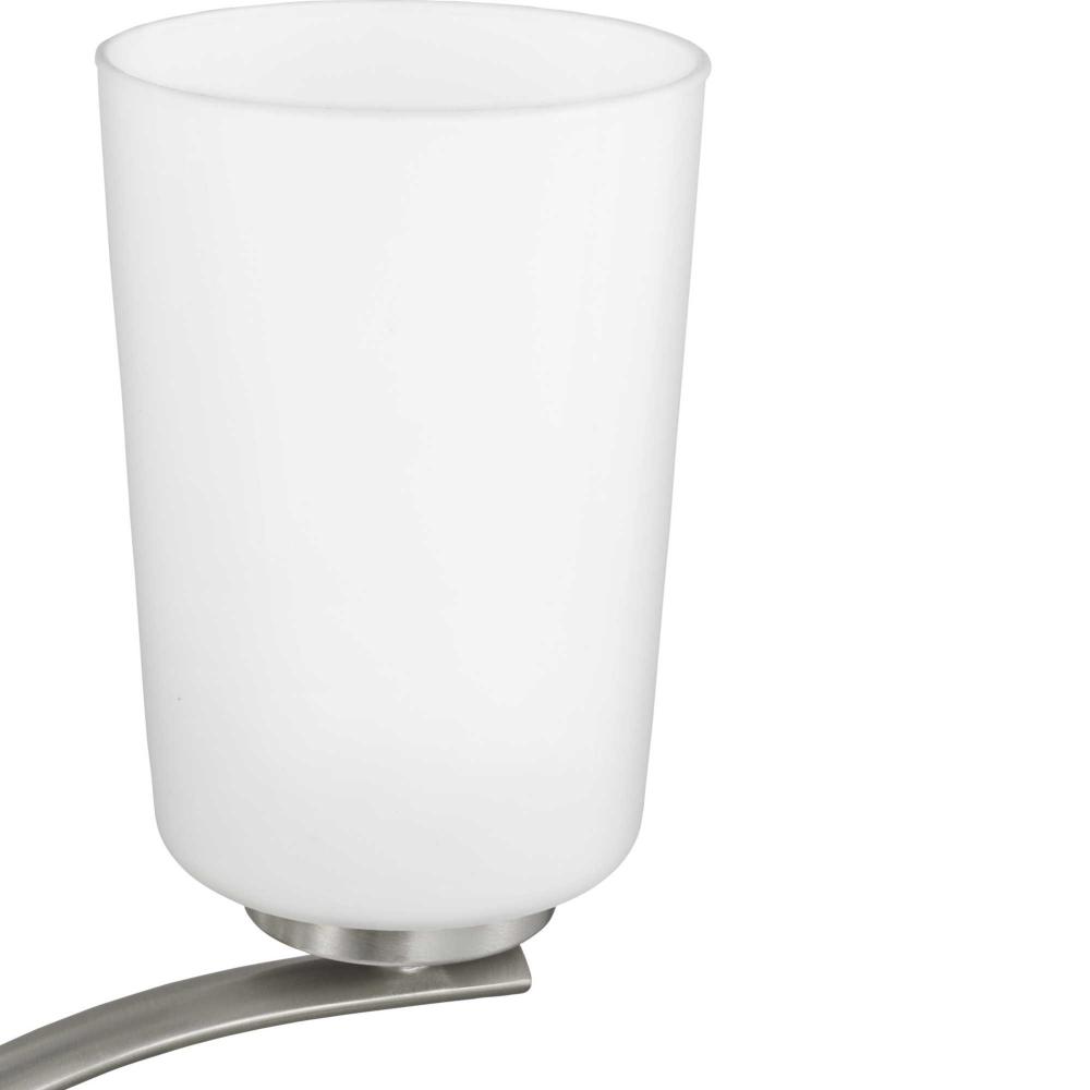 The clean design combines etched white glass shades with a curved arms and simple, straight bars