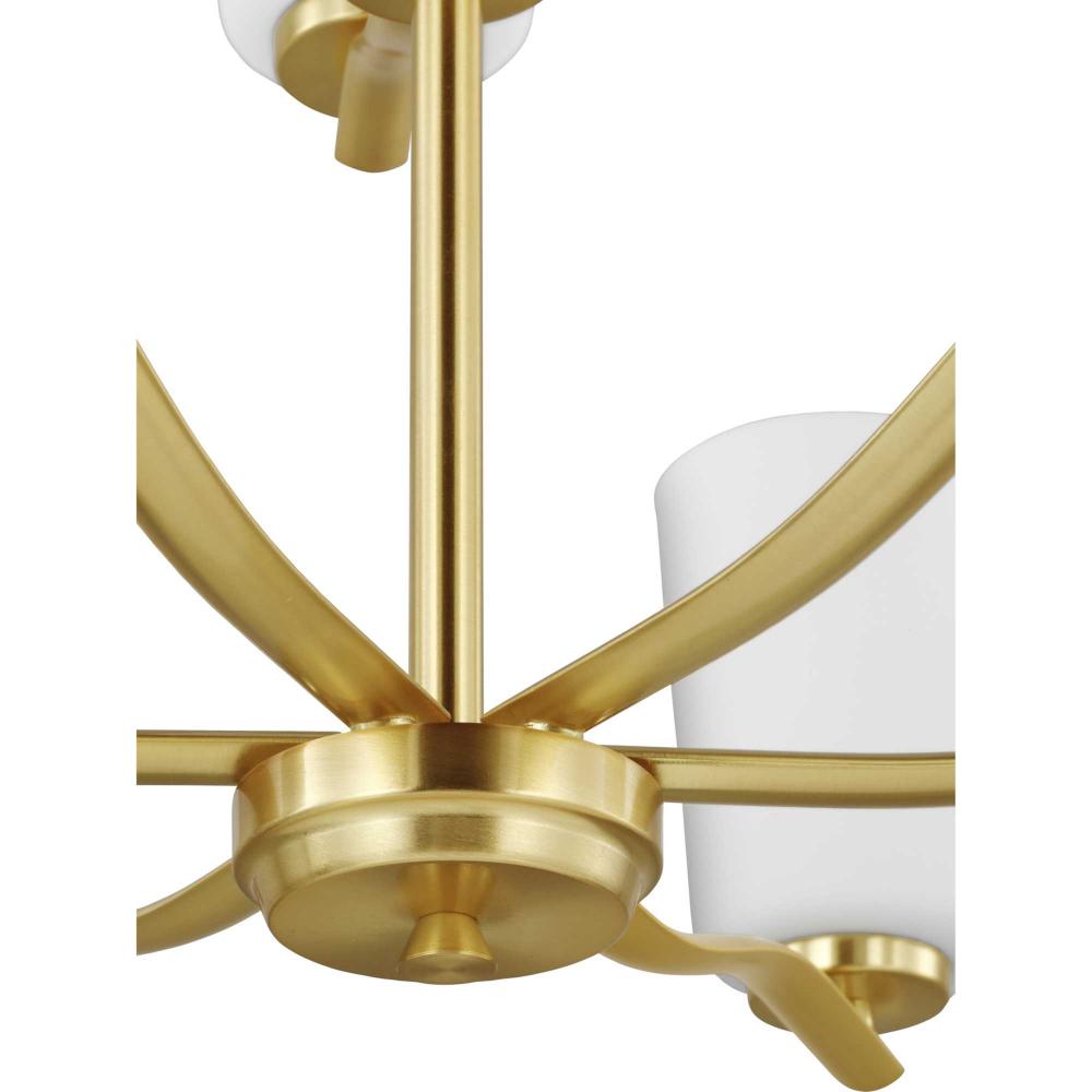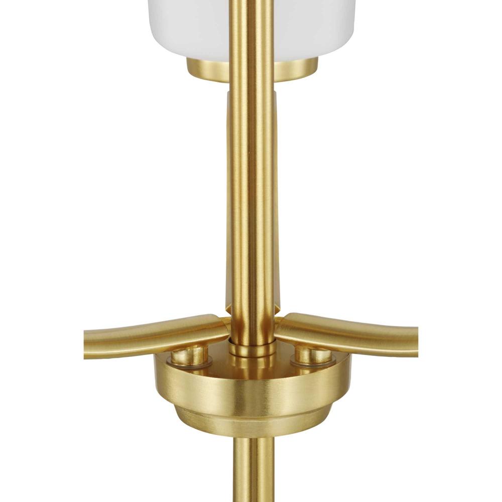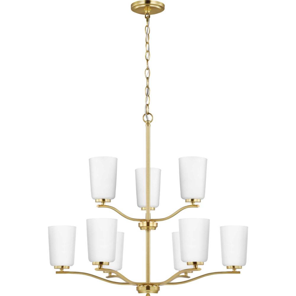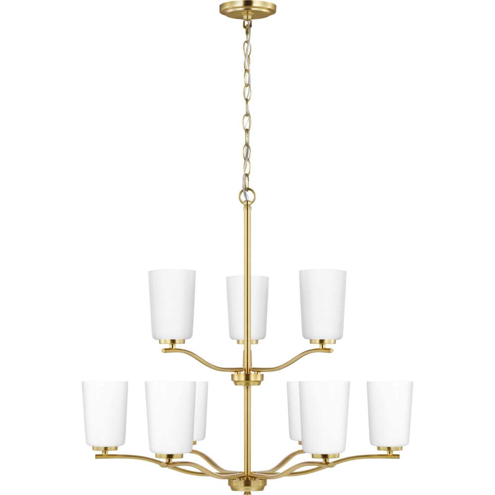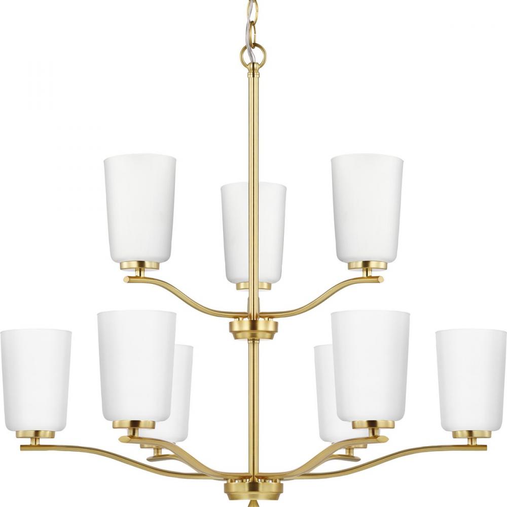 Fundamentally modern but with a traditional twist, the Adley double-tiered chandelier combines etched white glass shades with a curved arms and simple, straight bars finished in satin brass. This light is an elegant choice for illuminating dining rooms, halls and home theaters or great rooms in transitional settings and contemporary settings. The fixture has 60 in. of chain to customize it for a variety of ceiling heights and can be used on a sloped ceiling.