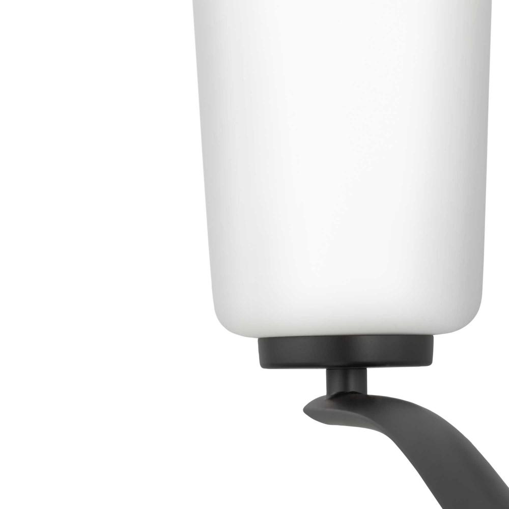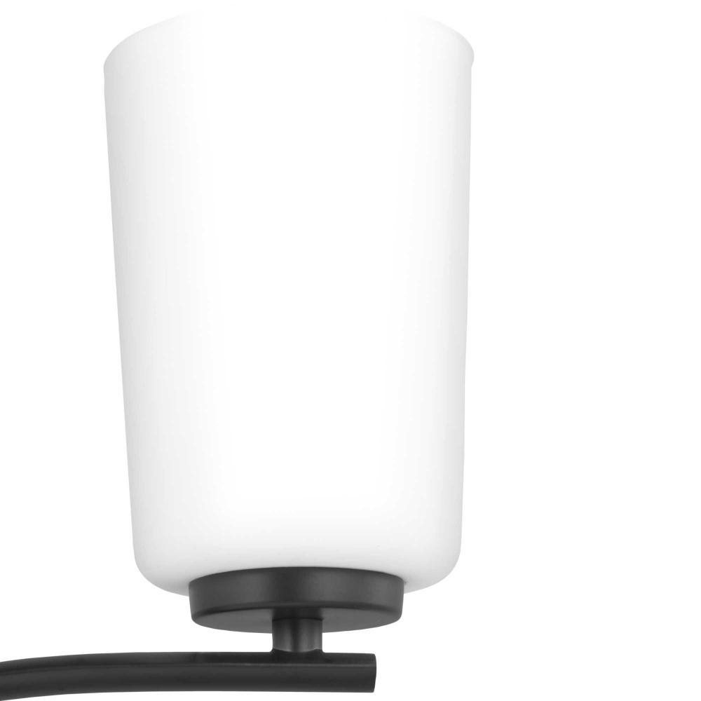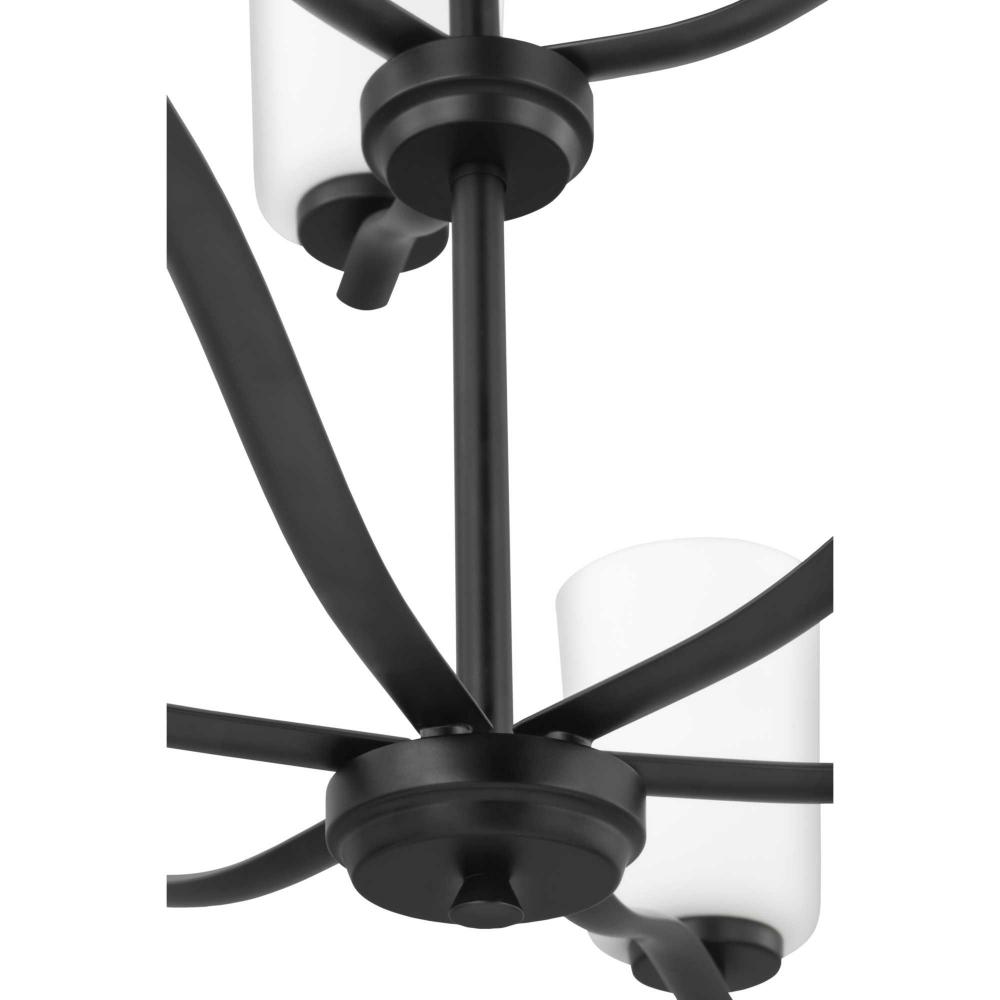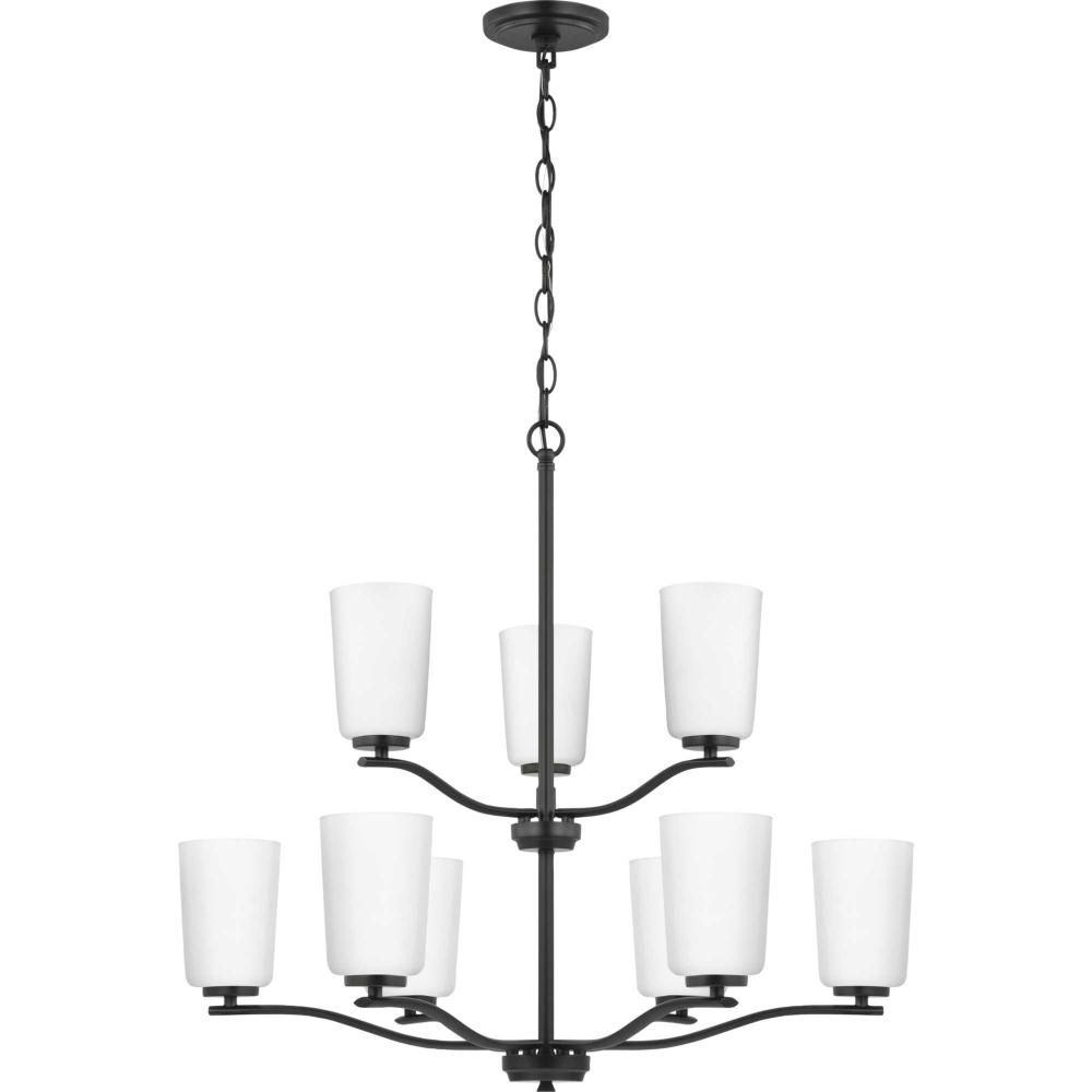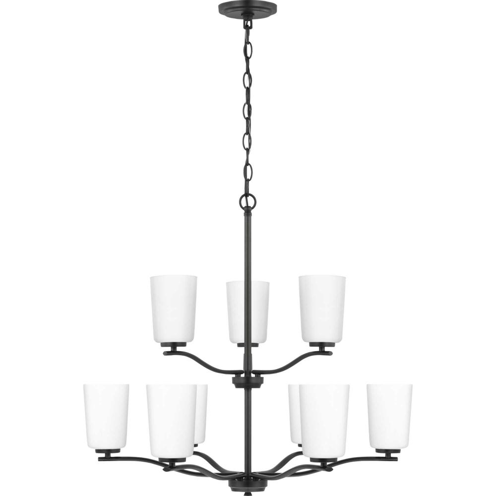 Fundamentally modern but with a traditional twist, the Adley double-tiered chandelier combines etched white glass shades with a curved arms and simple, straight bars finished in matte black. This light is an elegant choice for illuminating dining rooms, halls and home theaters or great rooms in transitional settings and contemporary settings. The fixture has 60 in. of chain to customize it for a variety of ceiling heights and can be used on a sloped ceiling.