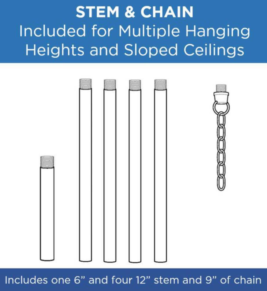 Includes two 6", eight 12" stems and 12 links of chain for a variety of mounting types and sloped ceiling