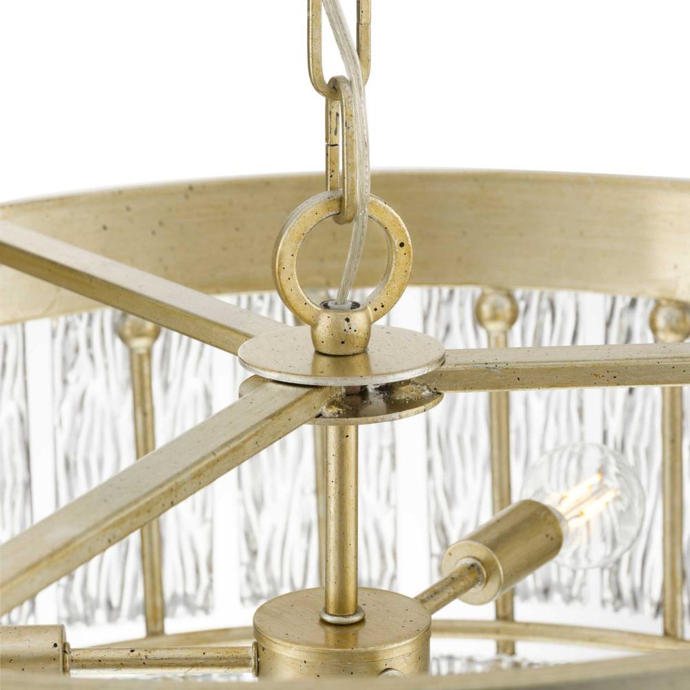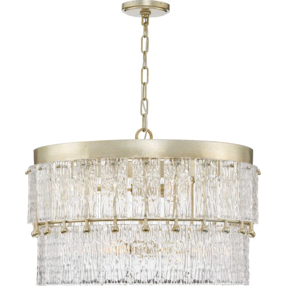 Add glamour to your home with the elegant Chevall Collection. Layers of distinctive artisanal glass encircle a richly burnished, Gilded Silver frame, creating a chandelier that offers a luxurious lighting experience. Glimmering illumination creates a sparkling ambiance that fills the room. This fixture is part of the Progress Lighting Design Series, a lighting collection offering fashionable styles and affordable luxury lighting for the home.