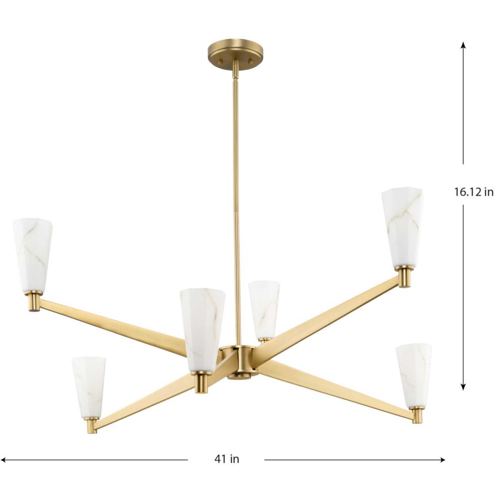 The Tosca Collection exudes a sense of motion from gracefully tapered arms that transcend traditional design boundaries. The Brushed Bronze chandelier holds geometric glass shades crafted with a faux alabaster finish that radiate patterns of light and shadow, adding depth and warmth that enchant any room. This fixture is part of the Progress Lighting Design Series, a lighting collection offering fashionable styles and luxury lighting for the home.