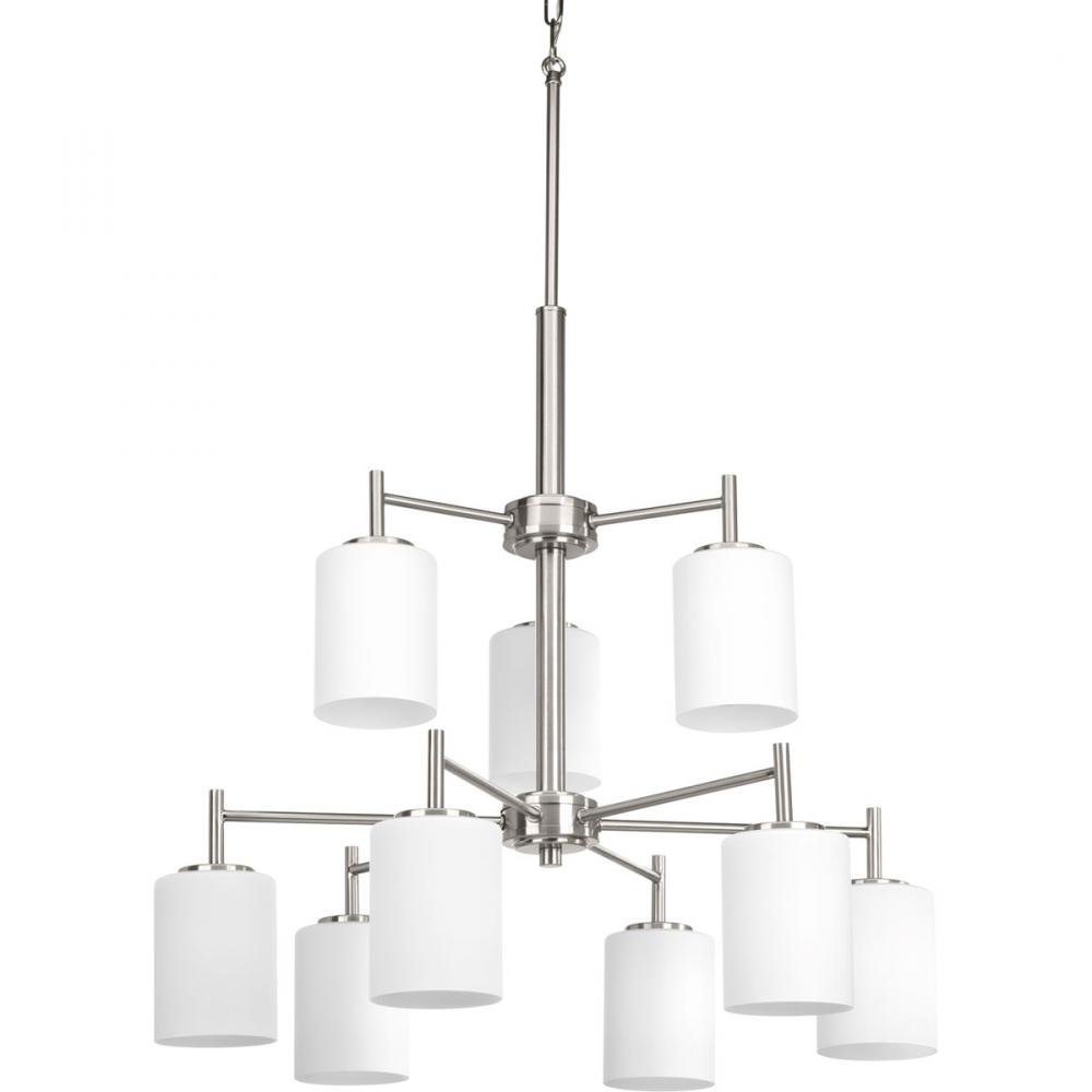 Nine-light, two-tier chandelier from the Replay Collection features a linear form that provides a pleasingly elegant accent to your home. A sleek, metallic finish is complemented by white glass diffusers for a clean, modern silhouette. Brushed Nickel finish.