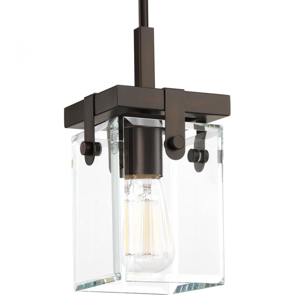 Inspired by modern architecture. Glayse features handsome details for variety of interior design styles. The frameless unbounded beveled glass creates beautiful light and reflection. The structure of Glayse is the focal point of the design, where form follows function. The one-light mini-pendant is complimented by an Antique Bronze finish.