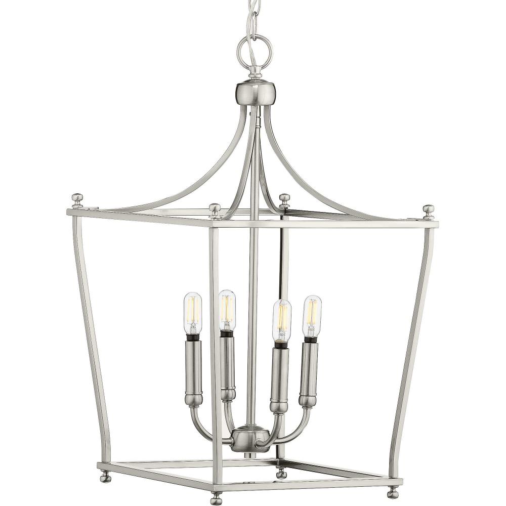 An open-cage metal frame creates a sophisticated, airy structure.;A beautiful brushed nickel finish coats the lantern-style frame for an eye-pleasing, handsome design.;Inside the frame perch smooth, simple light bases ready to offer your home a lovely glow