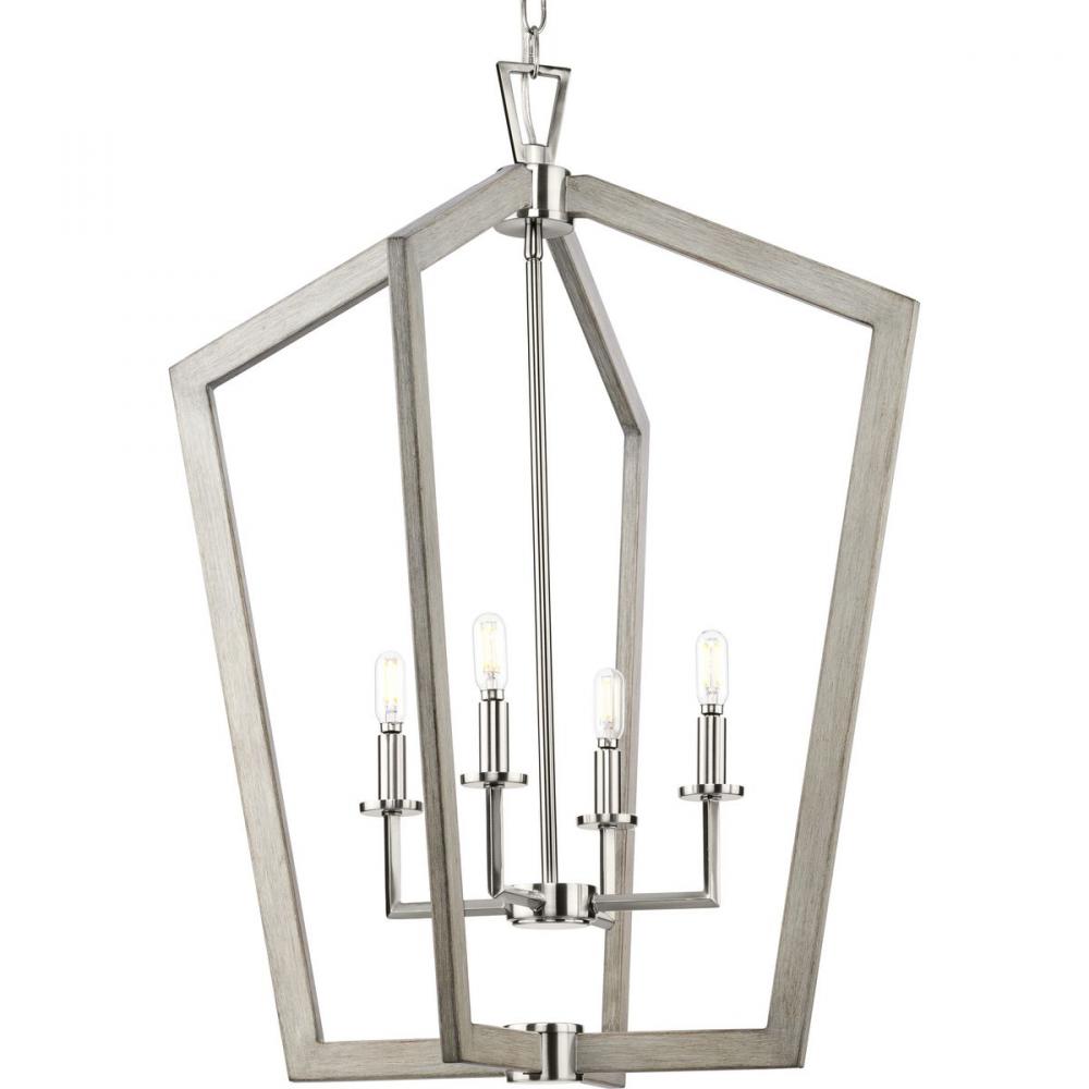Clean, modern lines combine with rustic elements in the Galloway Collection. A lightly distressed grey washed oak finish highlights an open, angular frame suspended from an adjustable chain and simple round canopy, all finished in subtle brushed nickel. Brushed nickel columns hold candelabra lights that glow brightly within the stately form to illuminate spaces in a casually elegant style. The larger scale and airy design of this foyer light makes it the perfect accompaniment for great rooms, bedrooms and dining rooms.