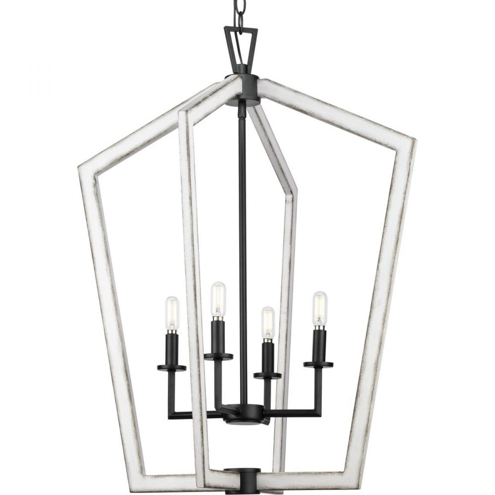 Clean, modern lines combine with rustic elements in the Galloway Collection. A lightly distressed white finish highlights an open, angular frame suspended from a triangular loop detail attached to an adjustable chain and simple round canopy, all finished in crisp matte black. Matte black columns hold candelabra lights that glow brightly within the stately form to illuminate spaces in a casually elegant style. The larger scale and airy design of this foyer light makes it the perfect accompaniment for great rooms, bedrooms and dining rooms.
