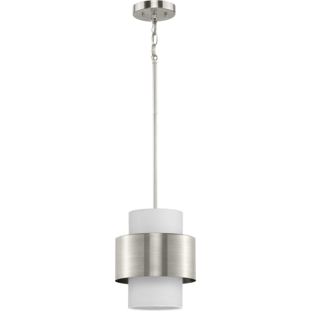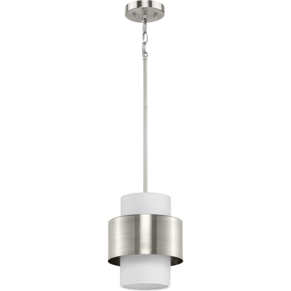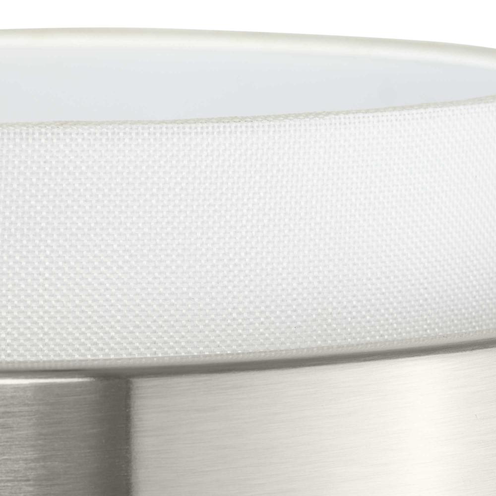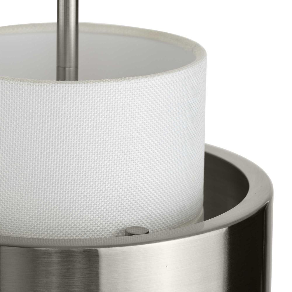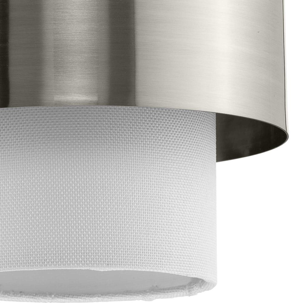 The Silva Collection uses a dramatic contrast of finish and material to present a captivating design. A white linen shade encompassed by a stunning metallic drum coated in a subtle brushed nickel finish establishes a clean, modern, uplifting statement. This fixture is part of the Progress Lighting Design Series, a lighting collection offering fashionable styles and affordable luxury lighting for the home.