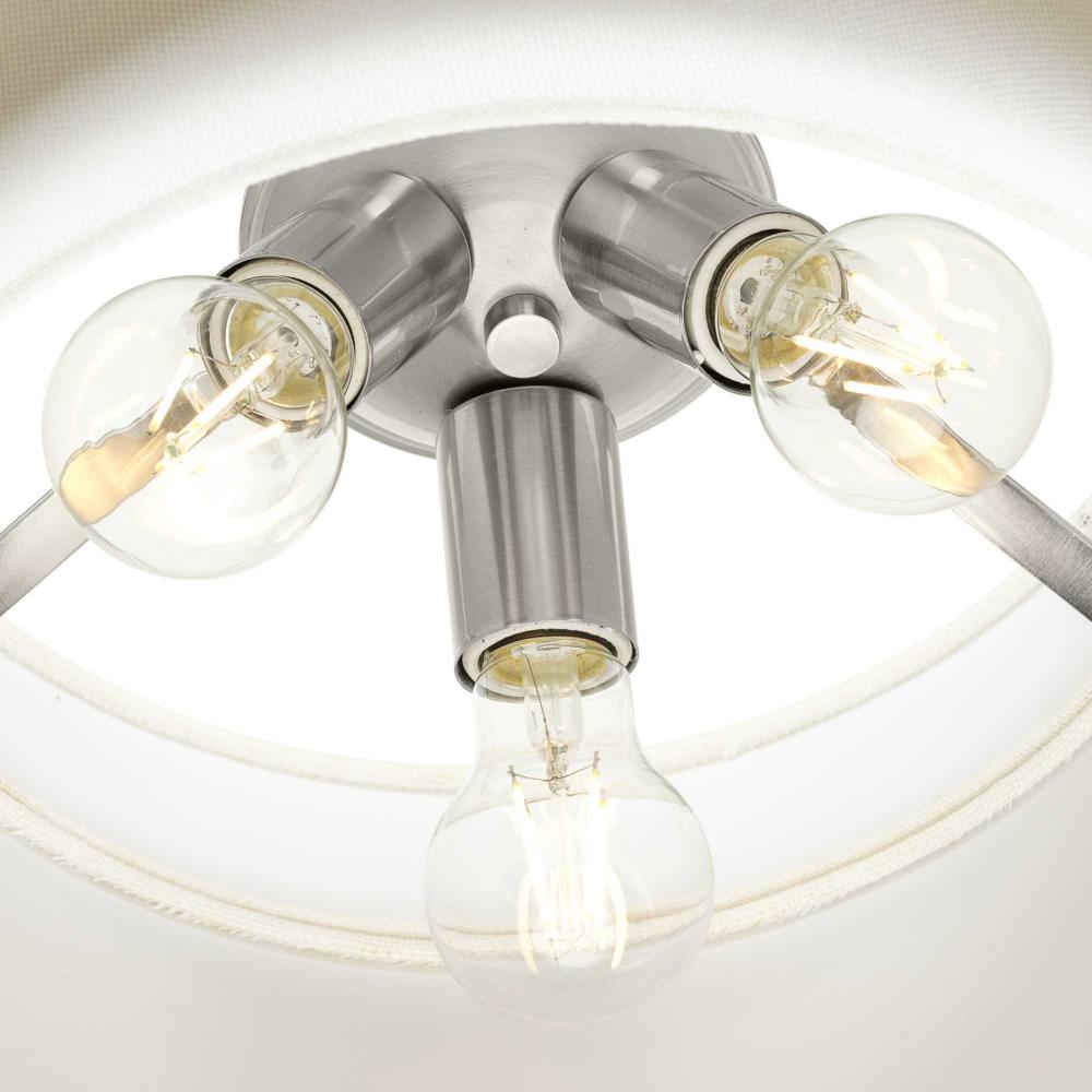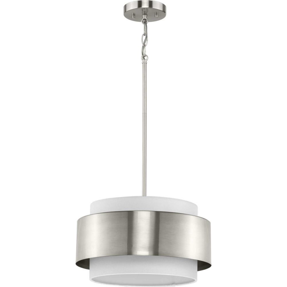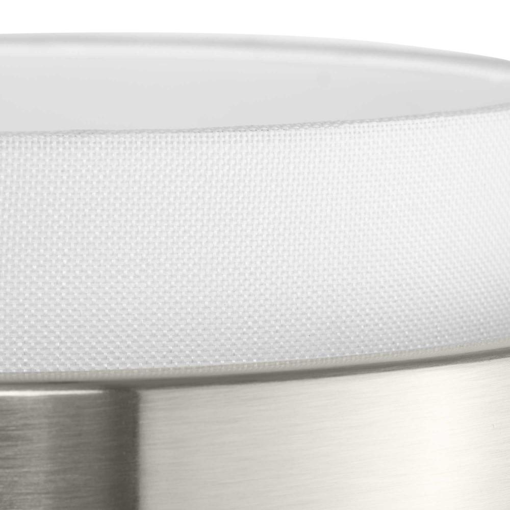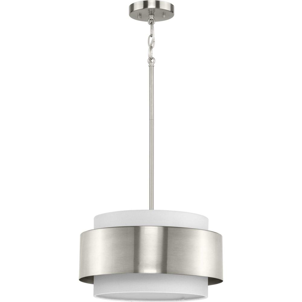 The Silva Collection uses a dramatic contrast of finish and material to present a captivating design. A white linen shade encompassed by a stunning metallic drum coated in a subtle brushed nickel finish establishes a clean, modern, uplifting statement. This fixture is part of the Progress Lighting Design Series, a lighting collection offering fashionable styles and affordable luxury lighting for the home.