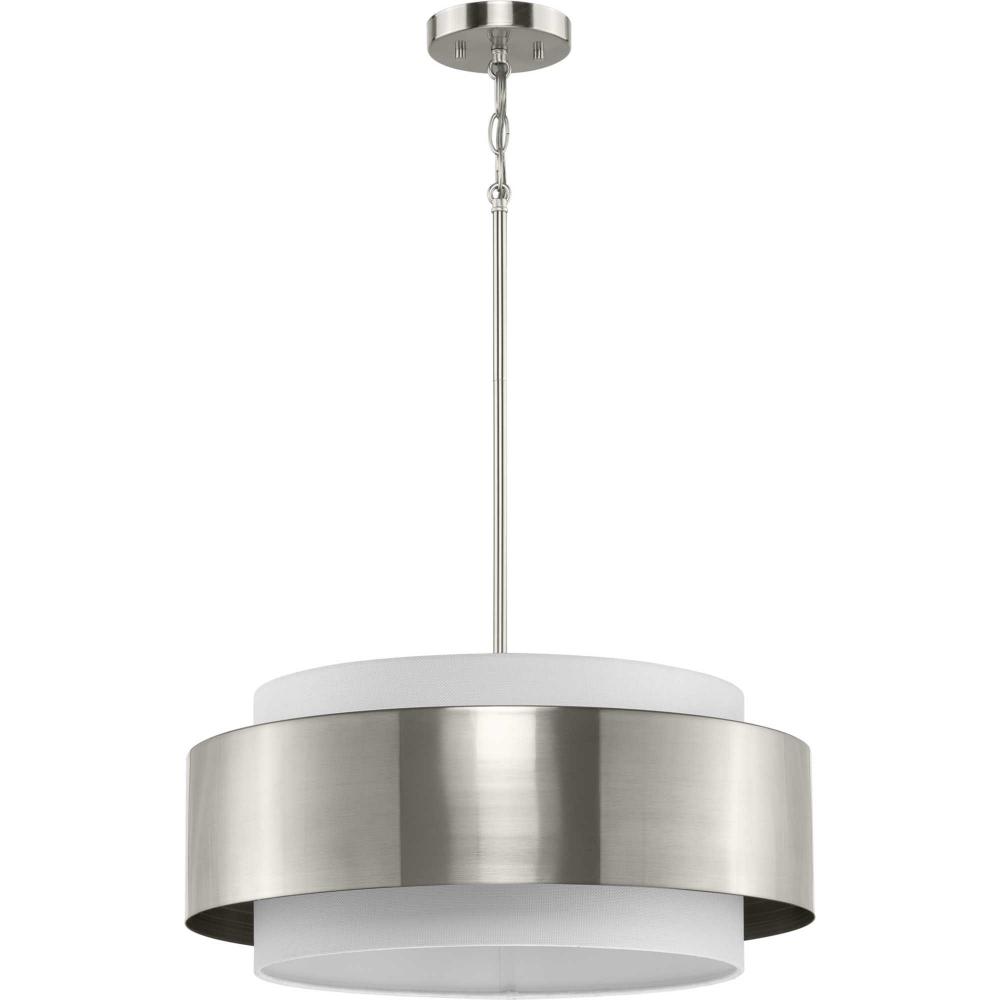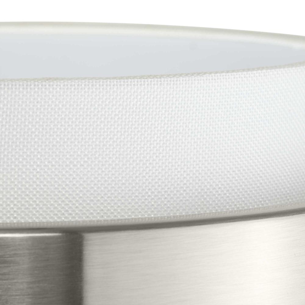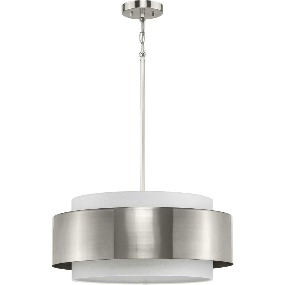The Silva Collection uses a dramatic contrast of finish and material to present a captivating design. A white linen shade encompassed by a stunning metallic drum coated in a subtle brushed nickel finish establishes a clean, modern, uplifting statement. This fixture is part of the Progress Lighting Design Series, a lighting collection offering fashionable styles and affordable luxury lighting for the home.