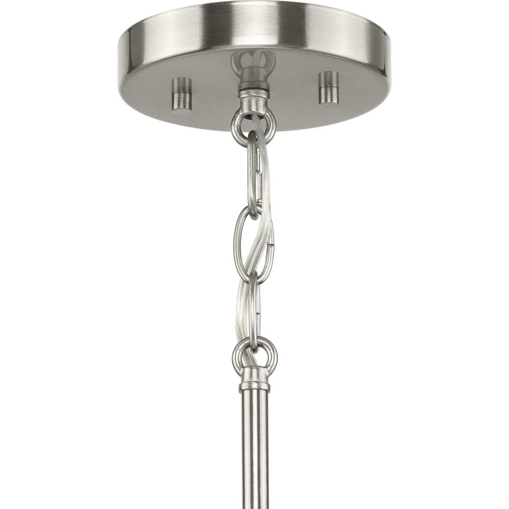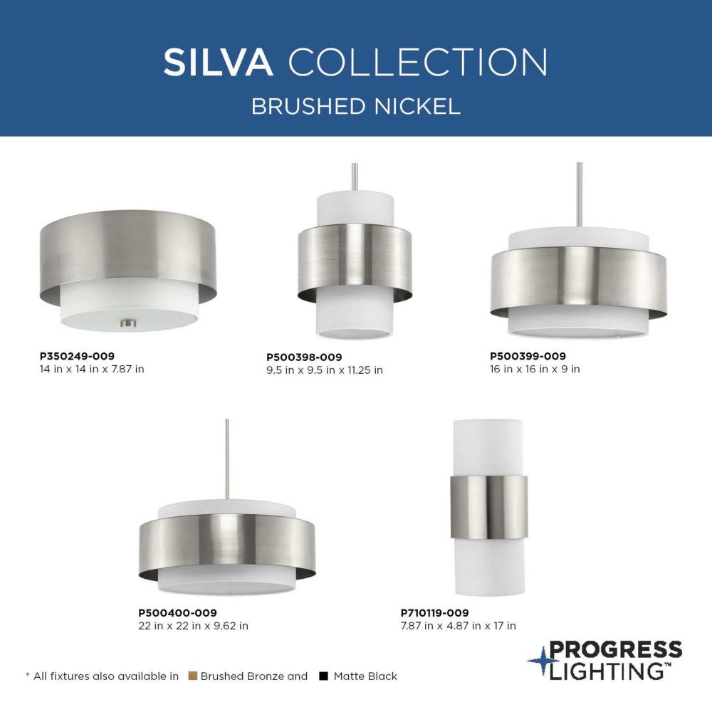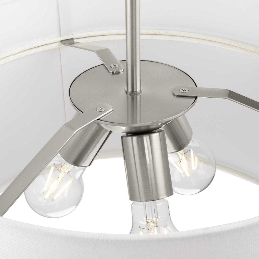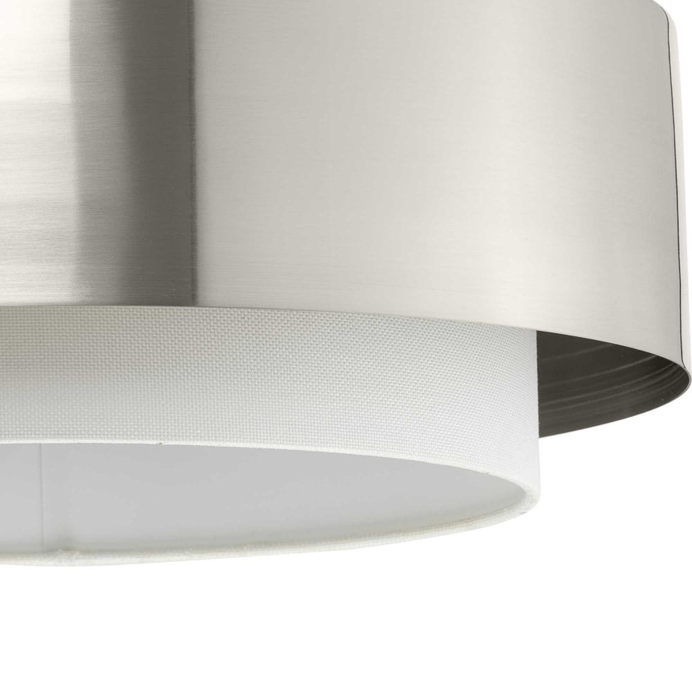 The Silva Collection uses a dramatic contrast of finish and material to present a captivating design. A white linen shade encompassed by a stunning metallic drum coated in a subtle brushed nickel finish establishes a clean, modern, uplifting statement. This fixture is part of the Progress Lighting Design Series, a lighting collection offering fashionable styles and affordable luxury lighting for the home.