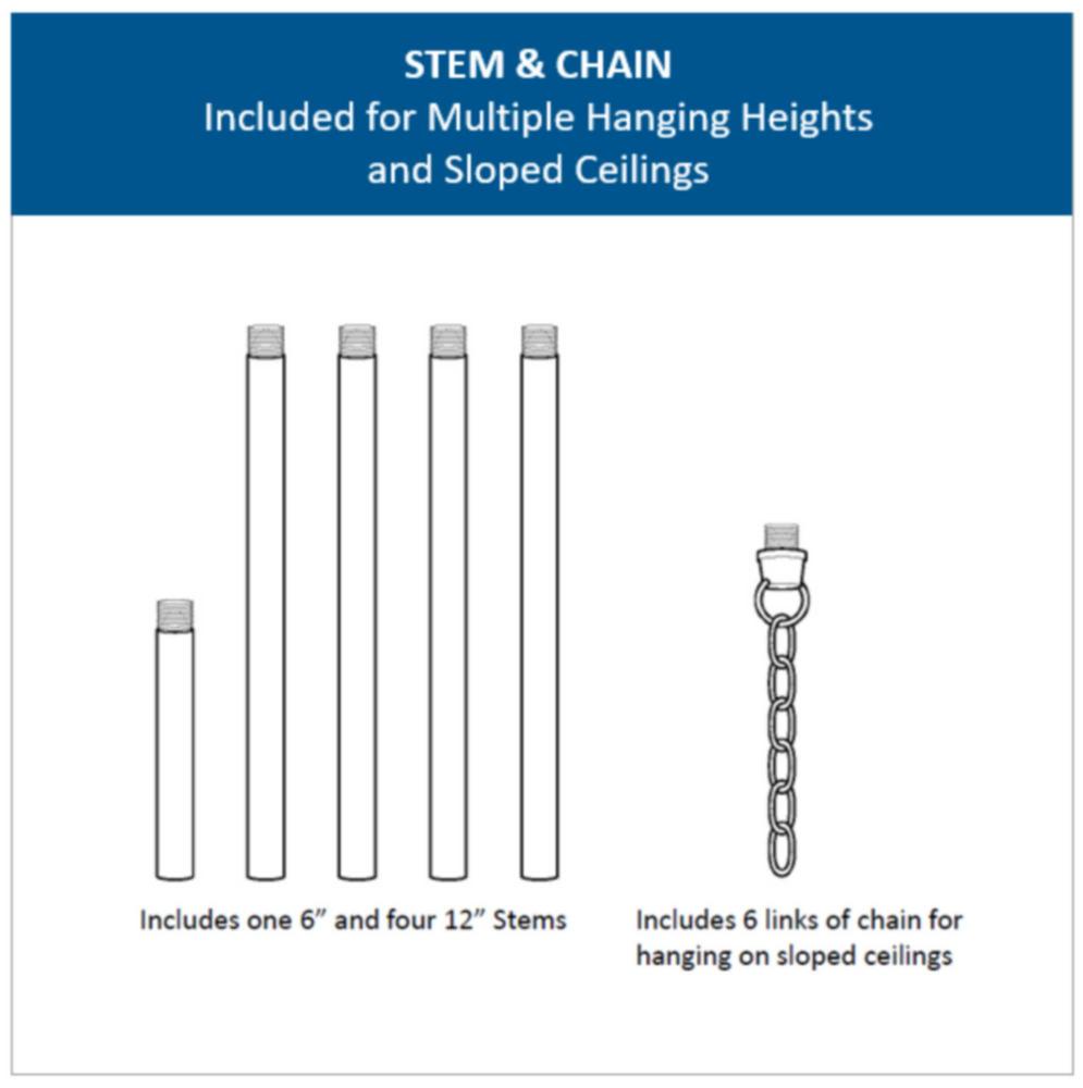 Includes one 6", four 12" stems and 6 links of chain for a variety of mounting types and sloped ceiling