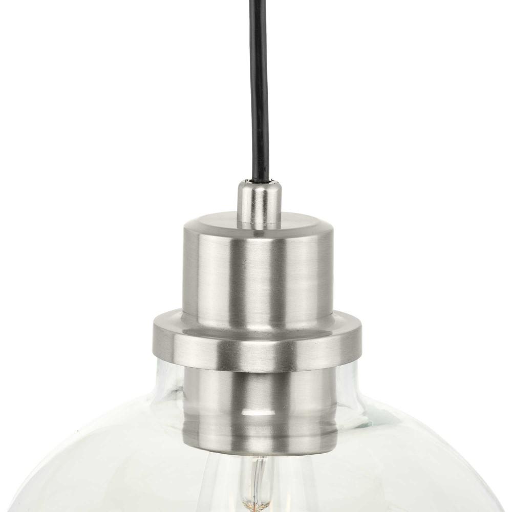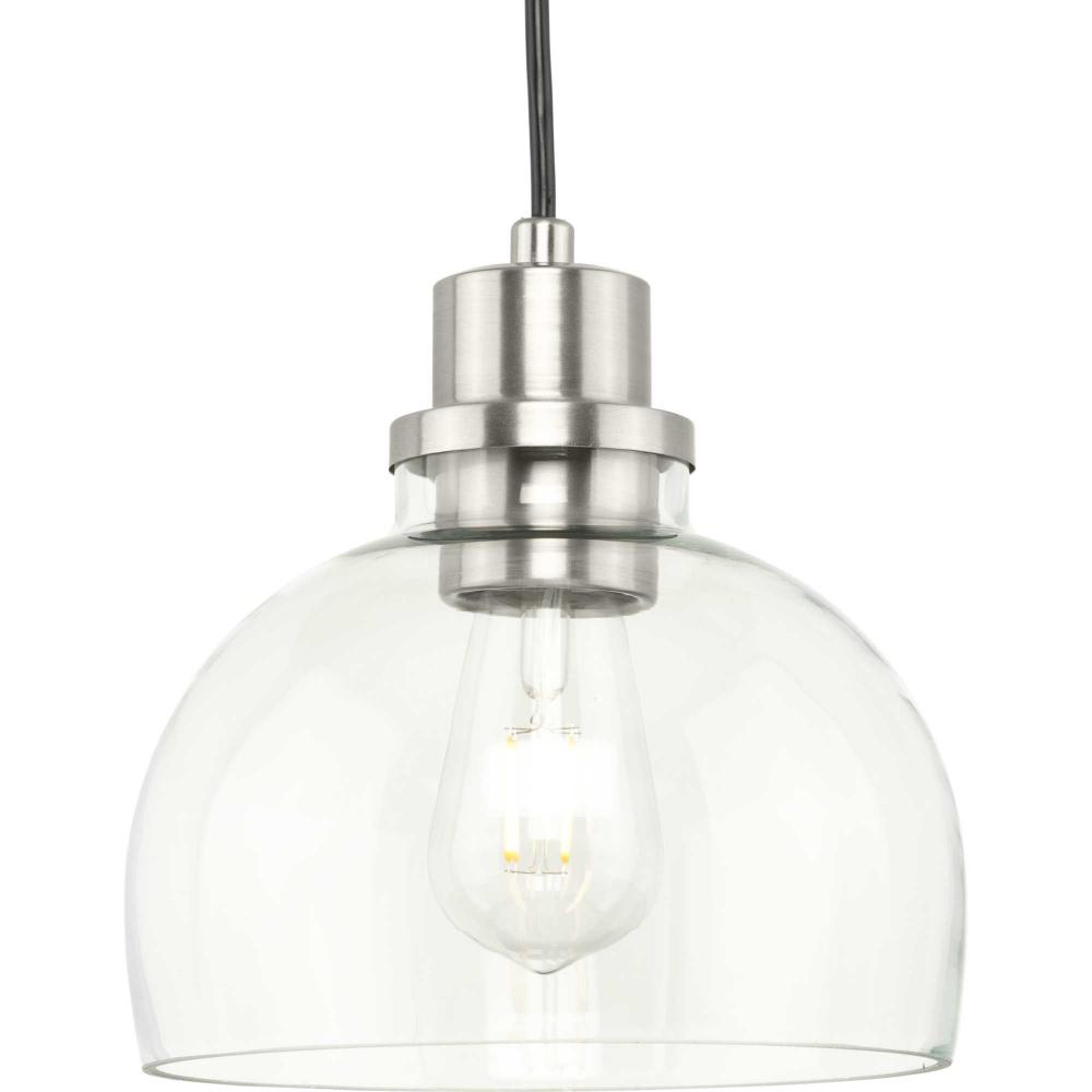 The pendant features a round clear glass shade with a metal cap and canopy finished in brushed nickel