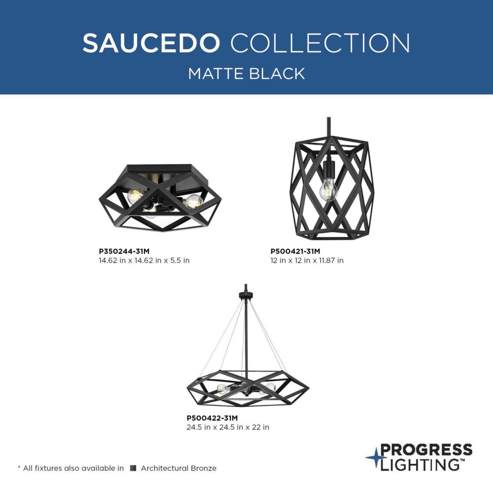 Dimension and depth define the artful architectural texture defining the Saucedo Collection. Inspired by an interplay of shadows and geometrical lines complement the shining light source within, elevating contemporary and modern interiors with an artful and distinct taste. Finished in a strong architectural bronze and matte black offer two multi-dimensional finishes enhancing the frame's one of a kind visual appeal in transitional rooms. This fixture is part of the Progress Lighting Design Series, a lighting collection offering fashionable styles and affordable luxury lighting for the home.
