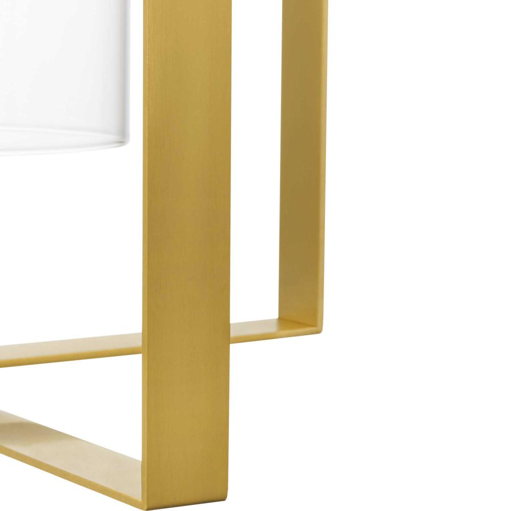 A lovely brushed gold frame define the fixture's distinct, angular silhouette