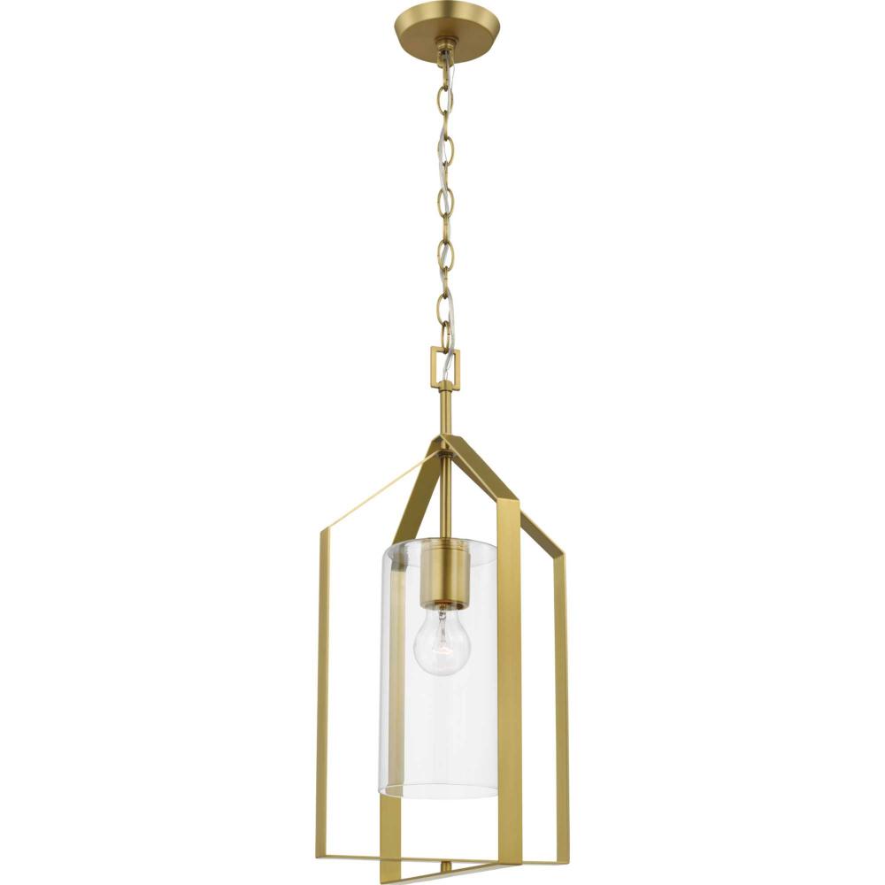 The foyer light is finished in a gorgeous brushed gold