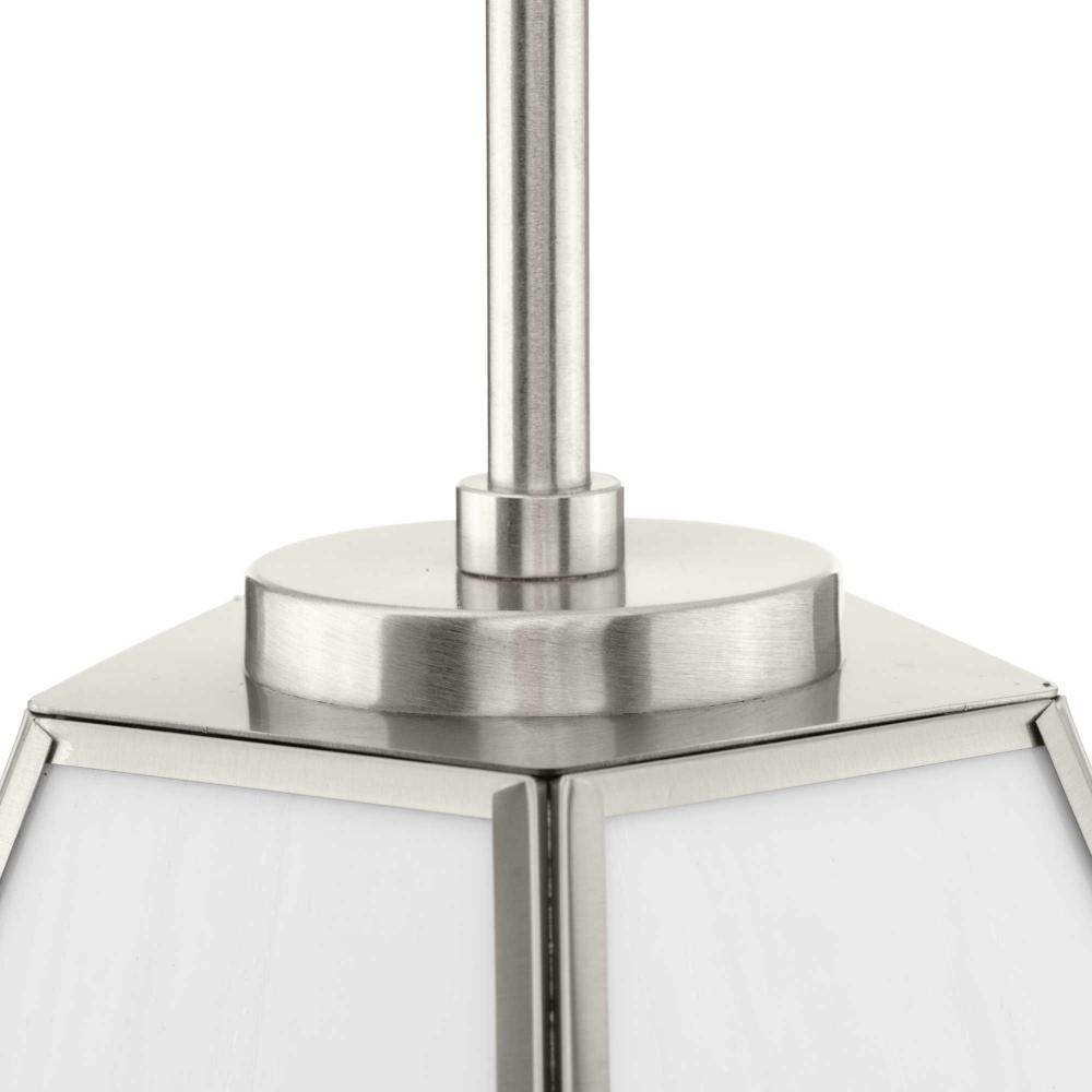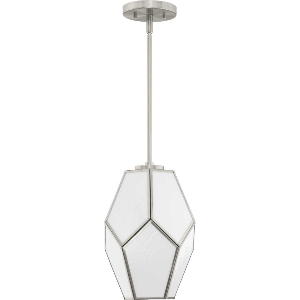 Charmingly distinctive, the Latham Collection glows from within. The Pendant Light is composed of a geometric framework finished in Brushed Nickel that features an artful array of handmade white art glass. Inspired as a modern expression of an origami lantern, the light delivers striking illumination to spaces below.