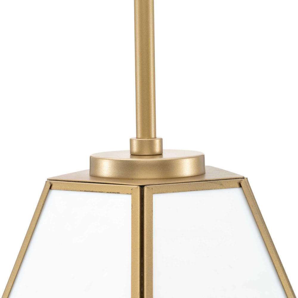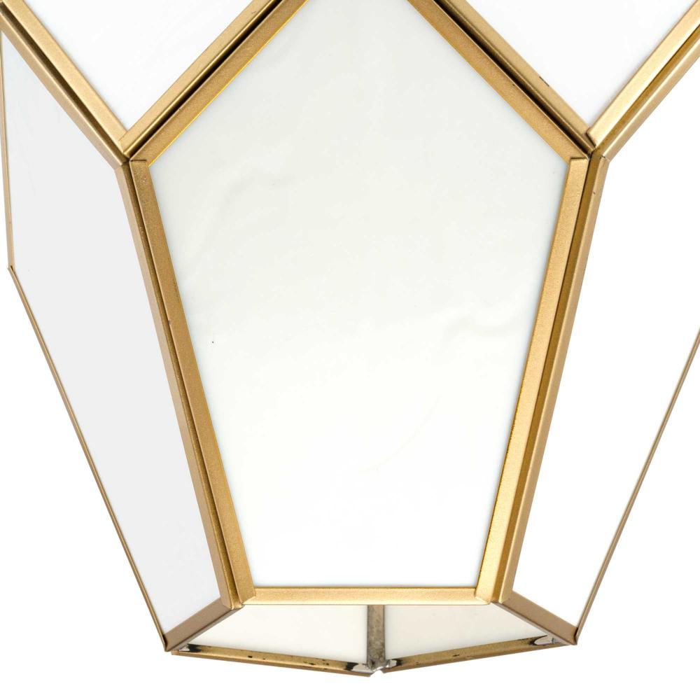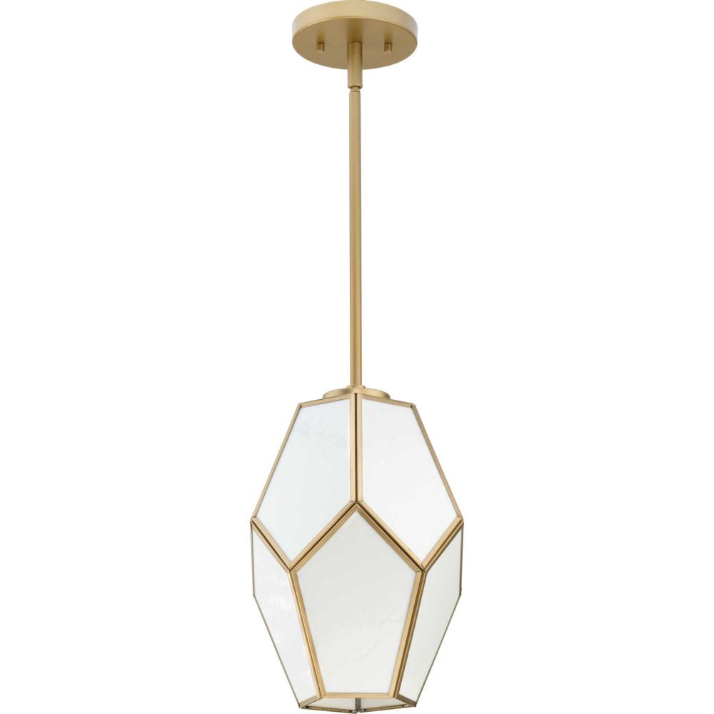 Charmingly distinctive, the Latham Collection glows from within. The Pendant Light is composed of a geometric framework finished in Vintage Gold that features an artful array of handmade white art glass. Inspired as a modern expression of an origami lantern, the light delivers striking illumination to spaces below.