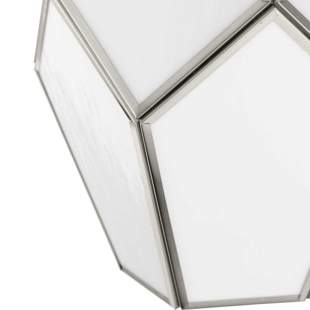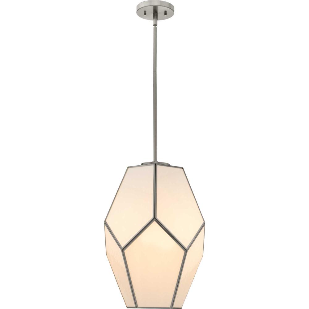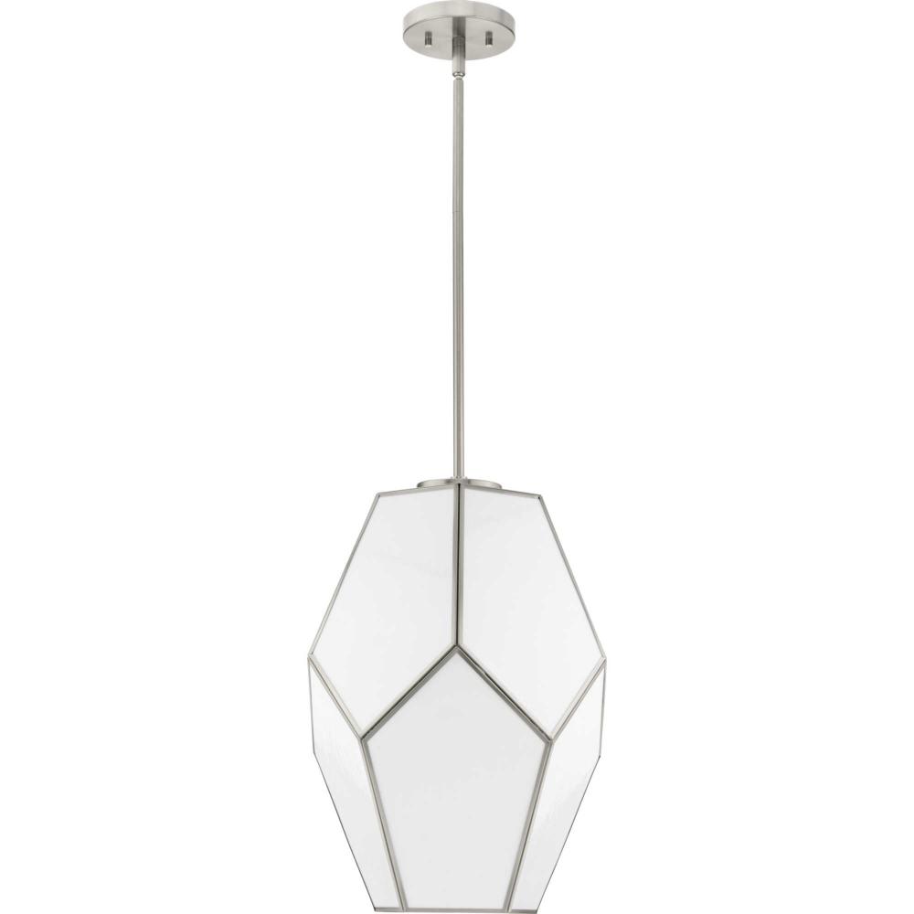Charmingly distinctive, the Latham Collection glows from within. The Pendant Light is composed of a geometric framework finished in Brushed Nickel that features an artful array of handmade white art glass. Inspired as a modern expression of an origami lantern, the light delivers striking illumination to spaces below.