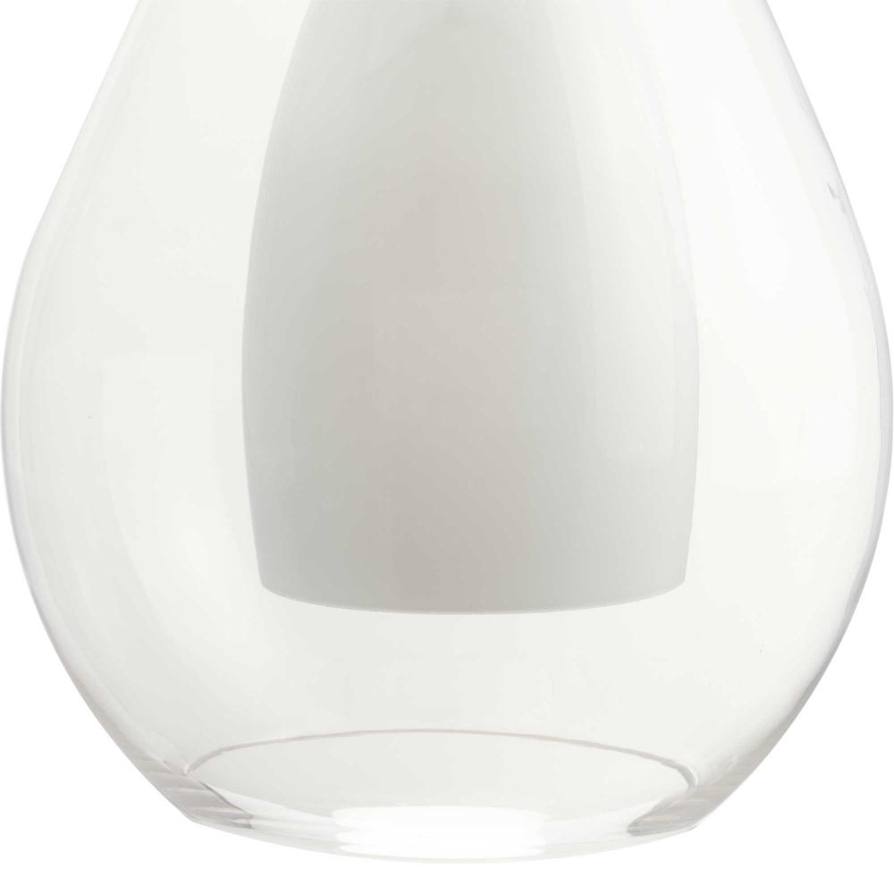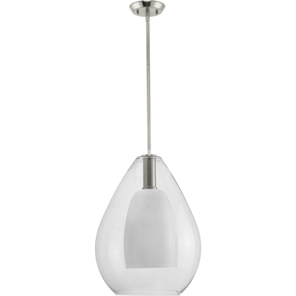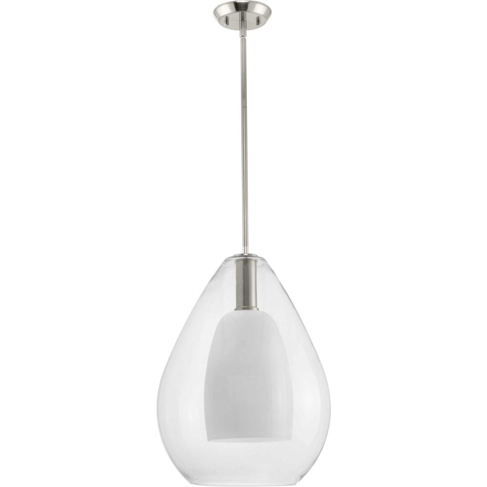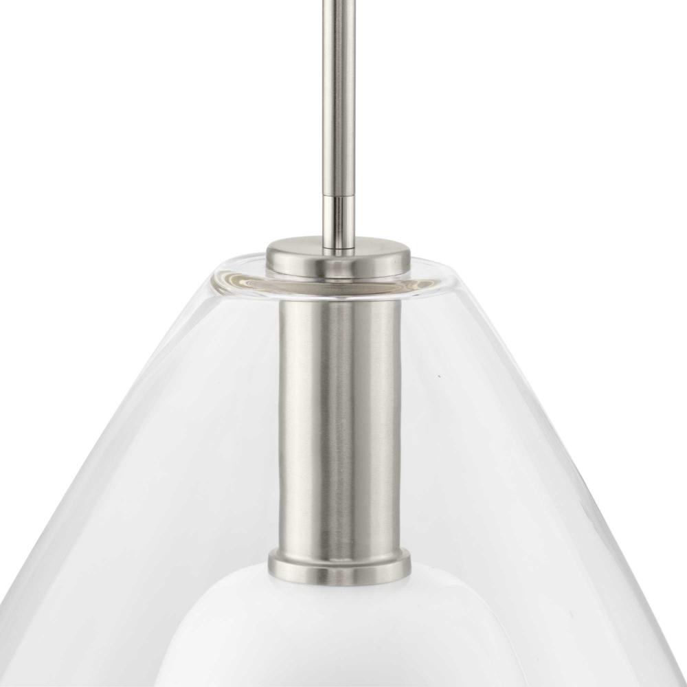 The large Carillon Pendant commands attention with its impressive scale and gleaming surface. An impressive clear bell-shaped glass shade surrounds a white opal diffuser suspended by hardware finished in subtle Brushed Nickel, creating a warm and inviting ambiance.This versatile pendant is slope ceiling adaptable and stem hung with several lengths of stem included, allowing for easy customization for your home's ceiling requirements.