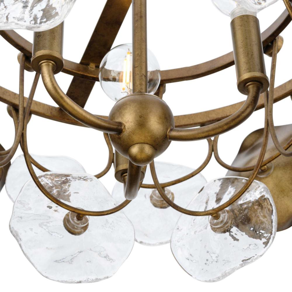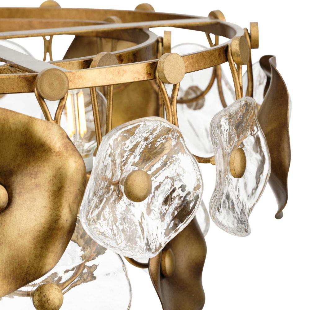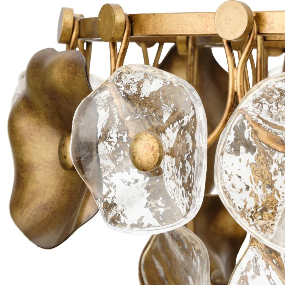 The Loretta Collection captures the serene feel of lily pads floating in a gently rippling pond. Glimmering artisanal clear glass is paired with handcrafted metal leaves finished in a soft, Gold Ombre patina.Light sources deliver an ambient glow behind the luxe glass and metallic discs that festoon its graceful frame. This fixture is part of the Progress Lighting Design Series, a lighting collection offering fashionable styles and affordable luxury lighting for the home.
