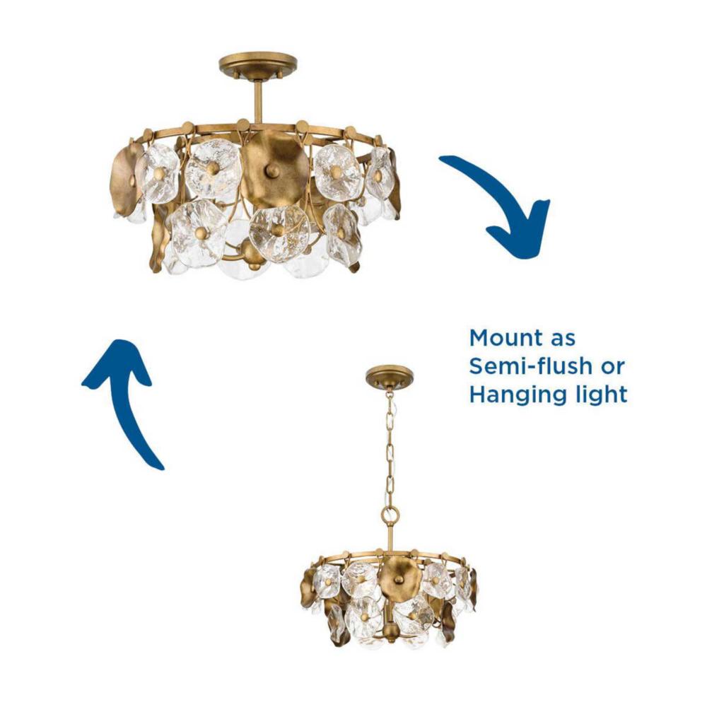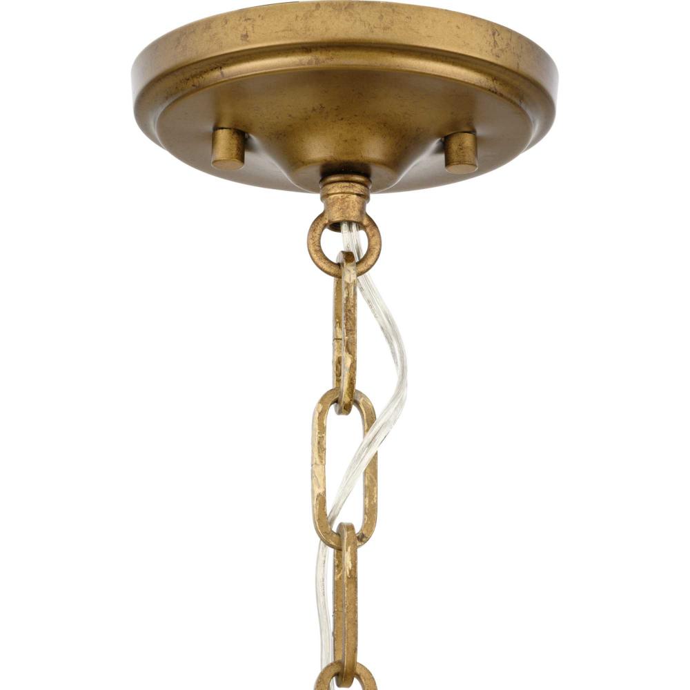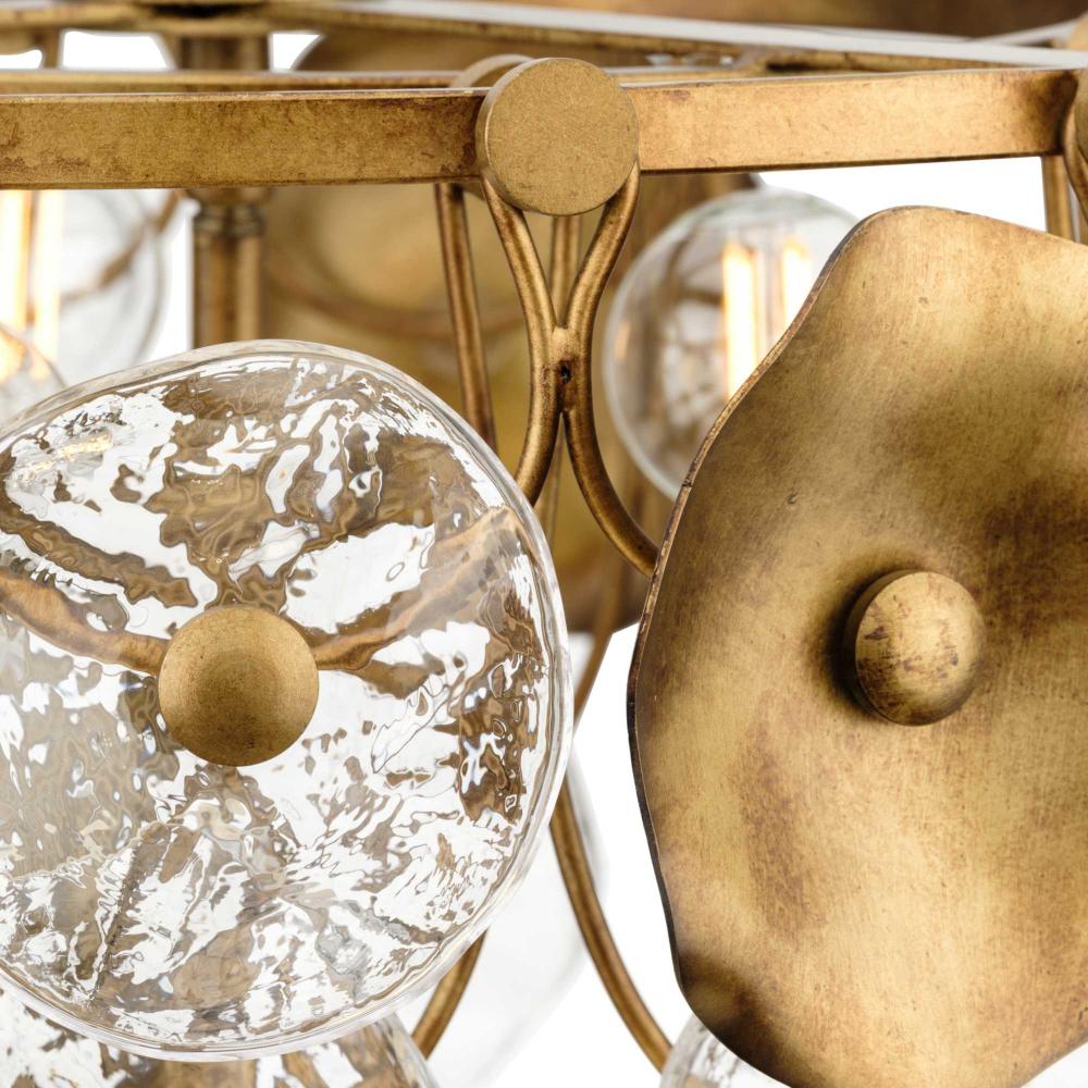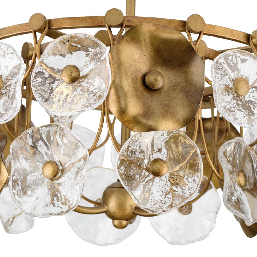 The Loretta Collection captures the serene feel of lily pads floating in a gently rippling pond. Glimmering artisanal clear glass is paired with handcrafted metal leaves finished in a soft, Gold Ombre patina.Light sources deliver an ambient glow behind the luxe glass and metallic discs that festoon its graceful frame. This fixture is part of the Progress Lighting Design Series, a lighting collection offering fashionable styles and affordable luxury lighting for the home.