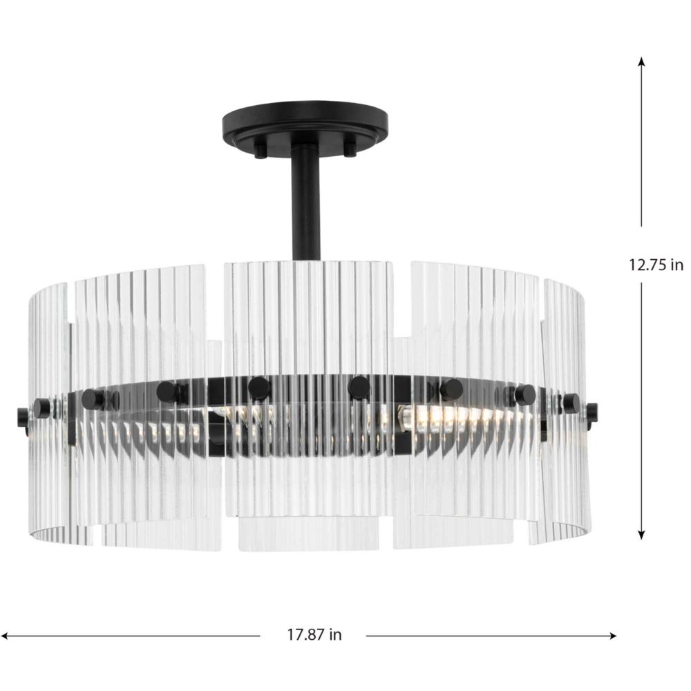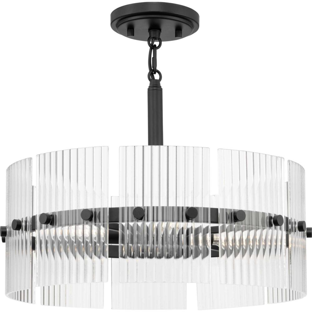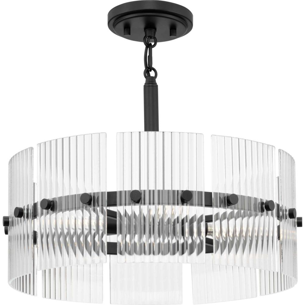 The Seville Collection ensconces light within a translucent design. A series of finely ridged architectural glass elements envelop a central frame finished in Matte Black to diffuse an ambient glow throughout the room. This fixture is part of the Progress Lighting Design Series, a lighting collection offering fashionable styles and luxury lighting for the home.