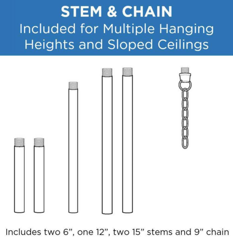 Includes one 6", four 12" stems and 6 links of chain for a variety of mounting types and sloped ceiling