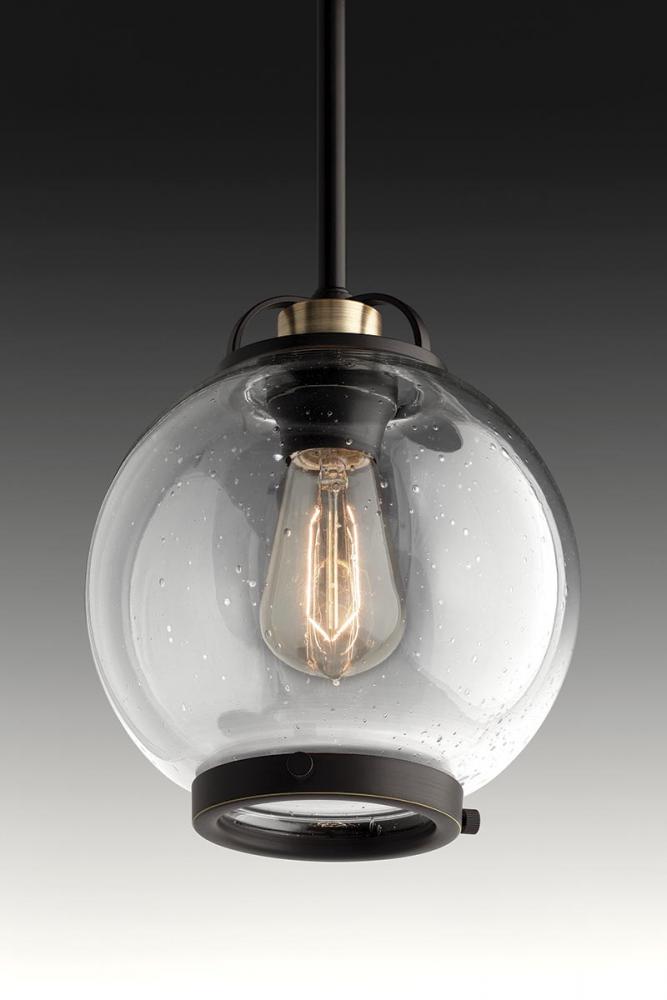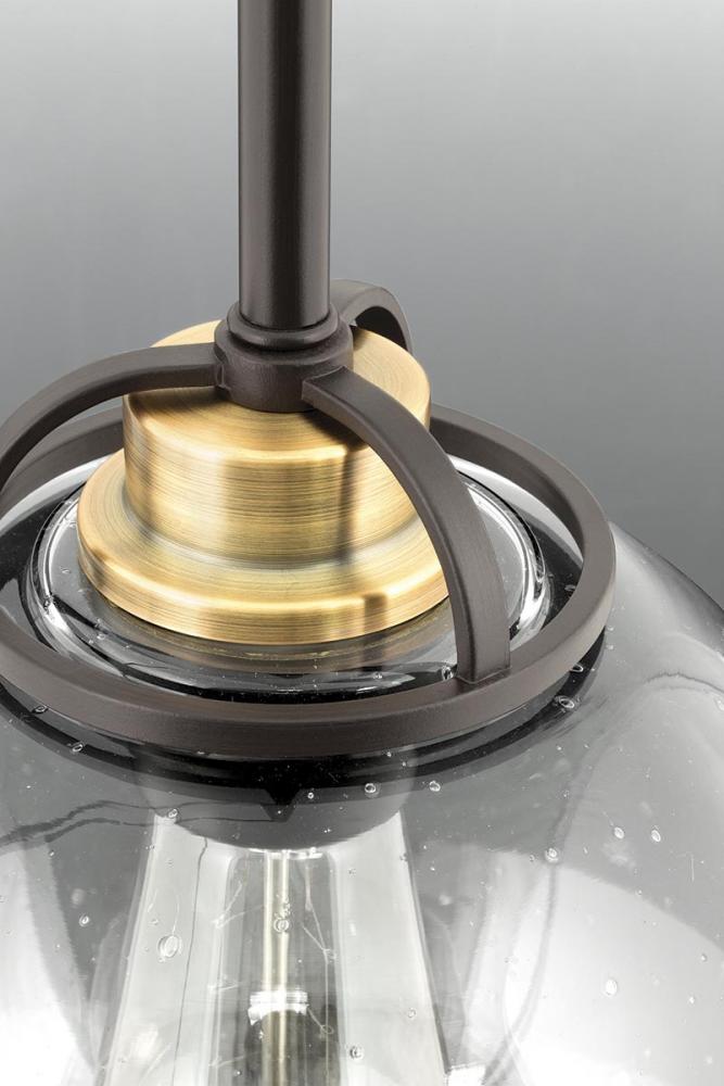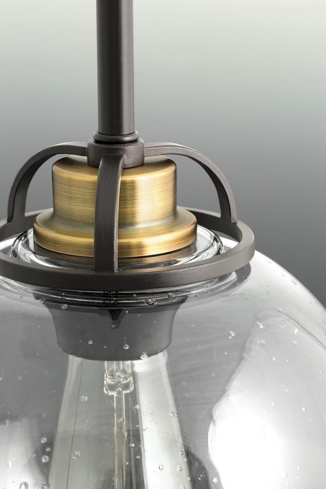 Ideal for commercial-style home kitchens or vintage dining areas.;Metal trim accent ring adds a finishing touch the spherical glass globe.;Clear seeded glass with an Antique Bronze frame.;Includes one 6", four 12" stems and 6 links of chain.