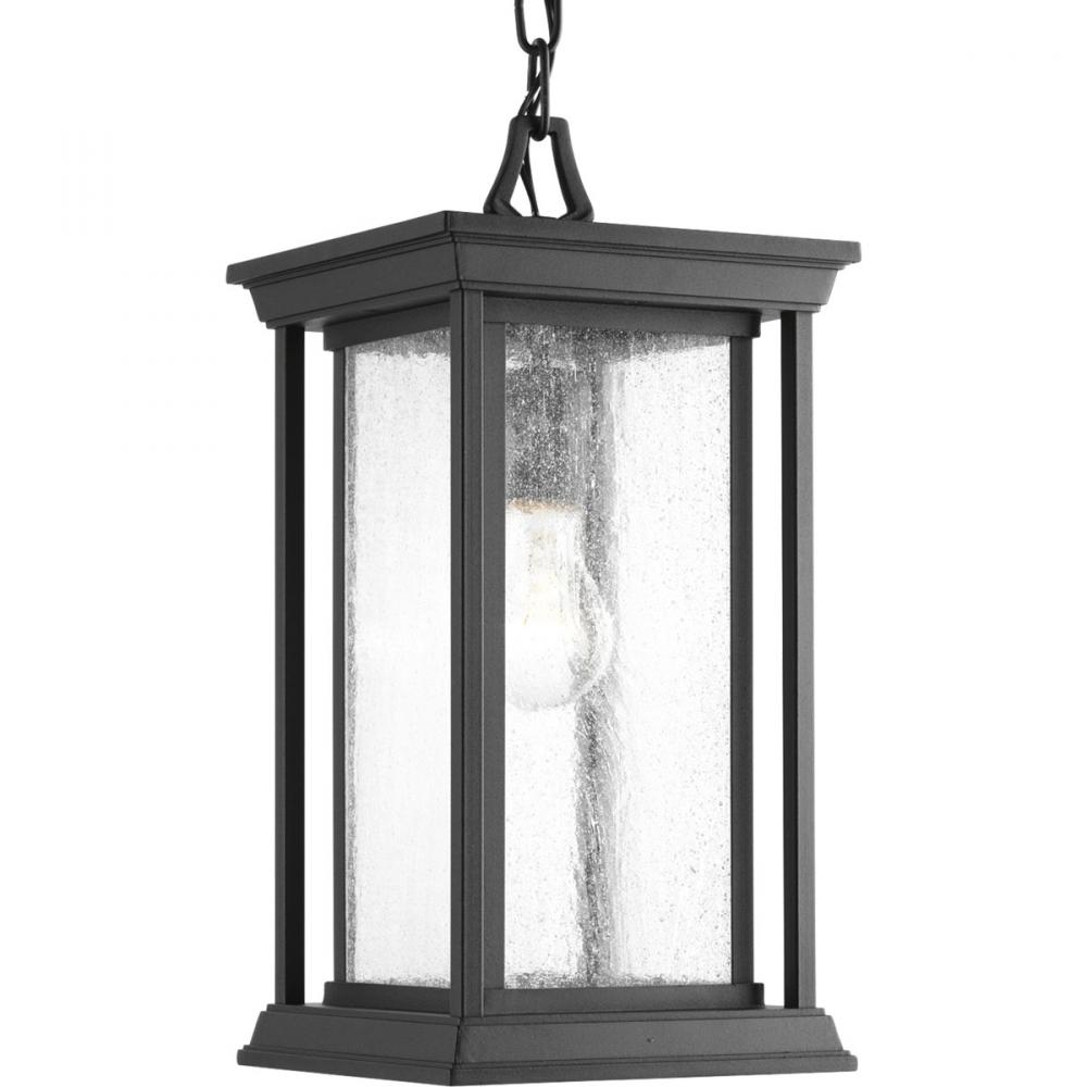 Features a Craftsman-inspired silhouette;An outdoor lantern with an elongated frame.;Frame is finished with clear seeded glass;Black finish.