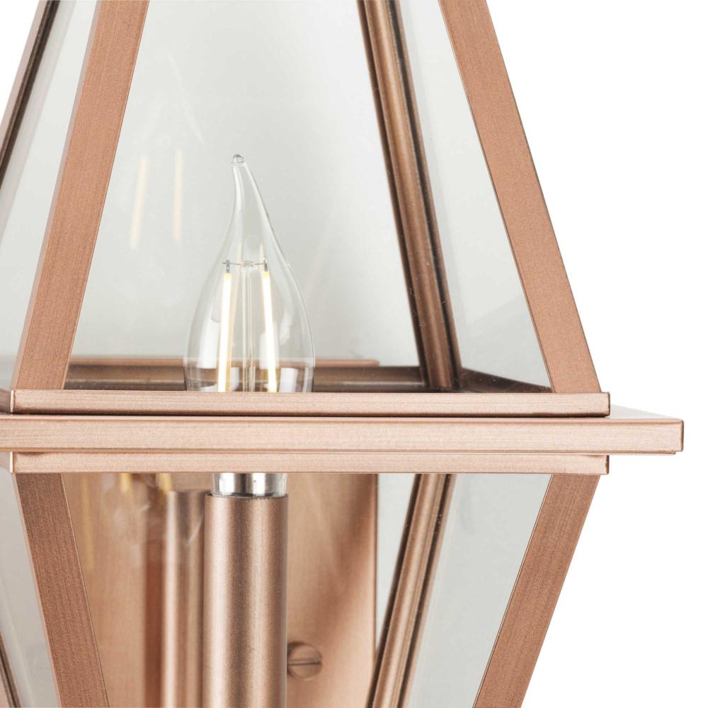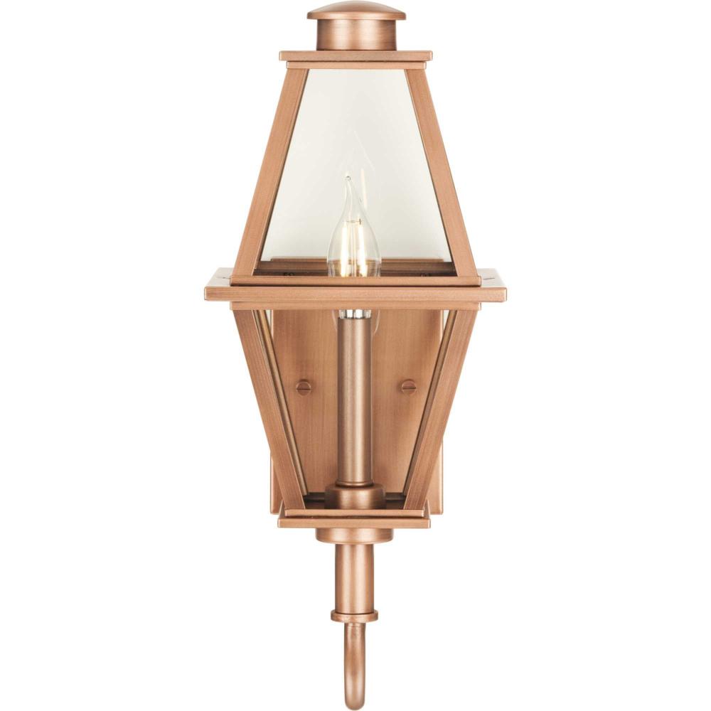 The Bradshaw Collection nods to historical style with its traditional lantern design, beautifully updating a homes curb appeal. A comforting glow is diffused through clear glass panes, creating a warm and romantic ambiance.The gracious lines of this small wall lantern, finished in mellow painted antique copper, elegantly complement exteriors of traditional, transitional and farmhouse settings. It is cULus wet location listed for use where water may be present, with a one-year warranty to guarantee your complete satisfaction. Progress Lighting products are designed for exceptional quality, reliability, and functionality.
