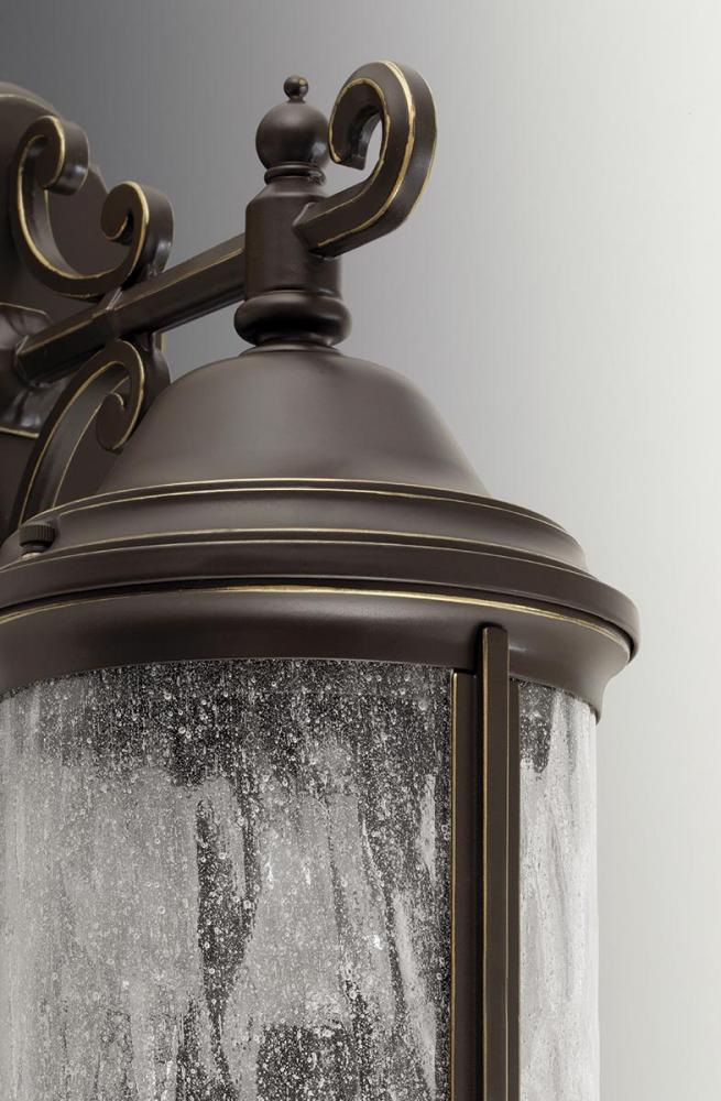 Inspired by lanterns from the Old World, the Ashmore collection incorporates handsome details, quill-scrolled arms and decorative finials. The water seeded glass is in a die-cast aluminum frame. Three-light 9-5/8" wall lantern in an Antique Bronze finish.
