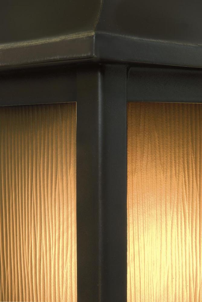 Jack Collection one-light small outdoor sconce features a rectilinear design and etched umber flax glass shade suspended in dramatic frame.