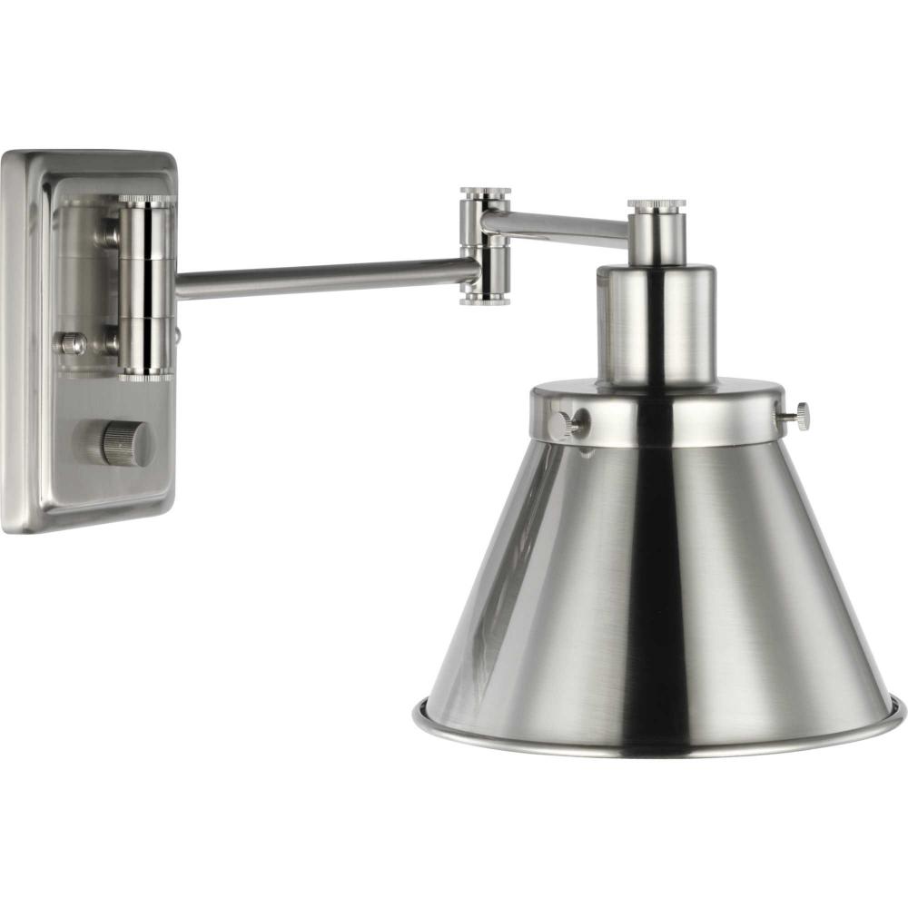 Enjoy focused task lighting with the industrial demeanor of this one-light swing arm wall bracket. A metal shade is ready to provide you with focused task light wherever illumination is called upon. The light fixture's signature adjustable arm is coated in a brushed nickel finish and makes this wall light a favorite choice for when you want to read your favorite novel before bed.