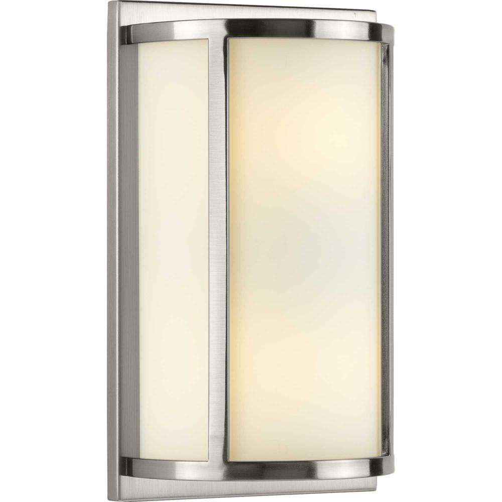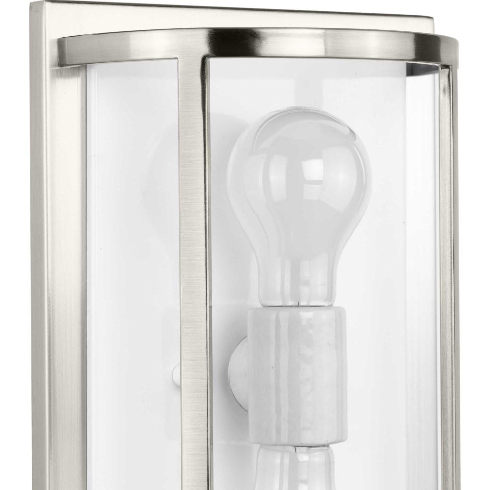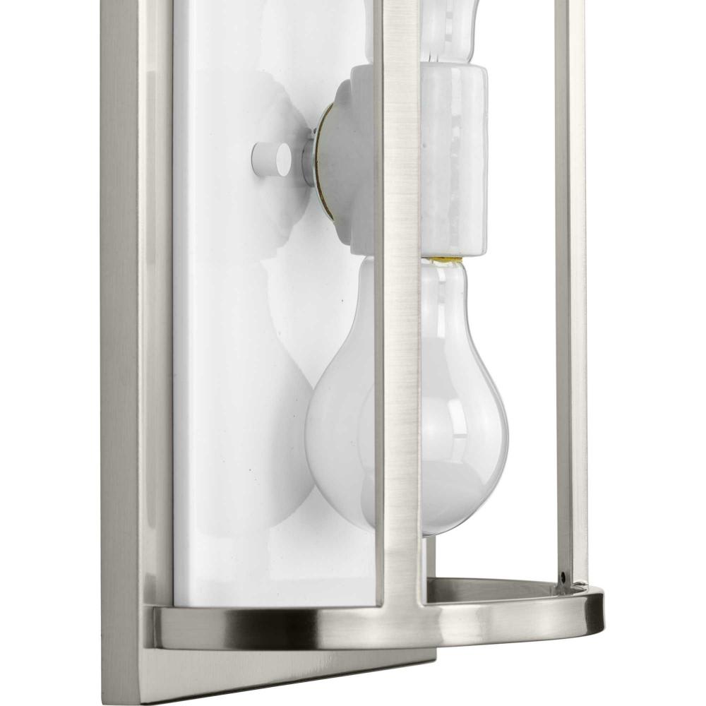 The wall sconce features a subtle brushed nickel finish