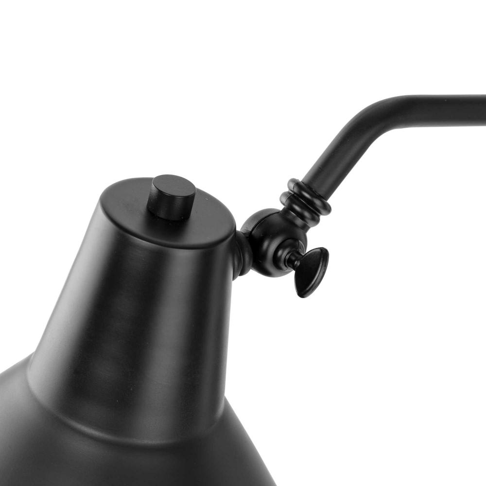 A metal cone-shaped shade has a locking clutch for tilting and is held by an angular stem, which rotates from side to side.