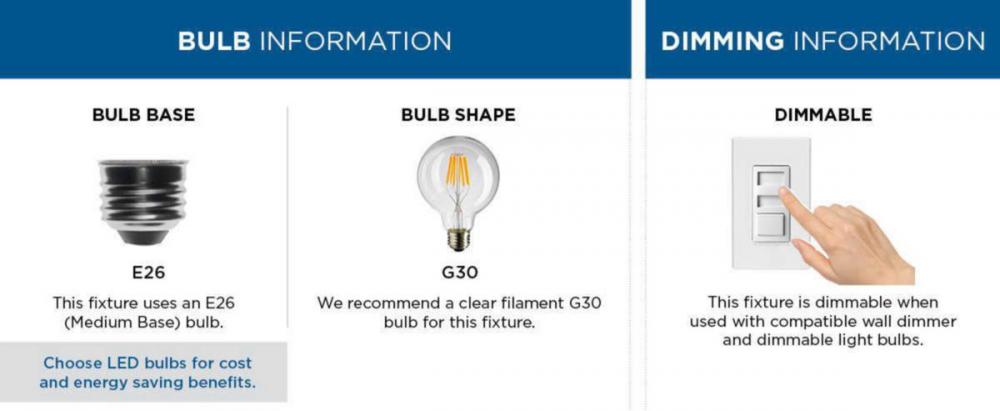 Uses (1) 60-Watt maximum, medium base bulbs or LED equivalent, that is sold separately, and dimmable when used in conjunction with a dimmable bulb