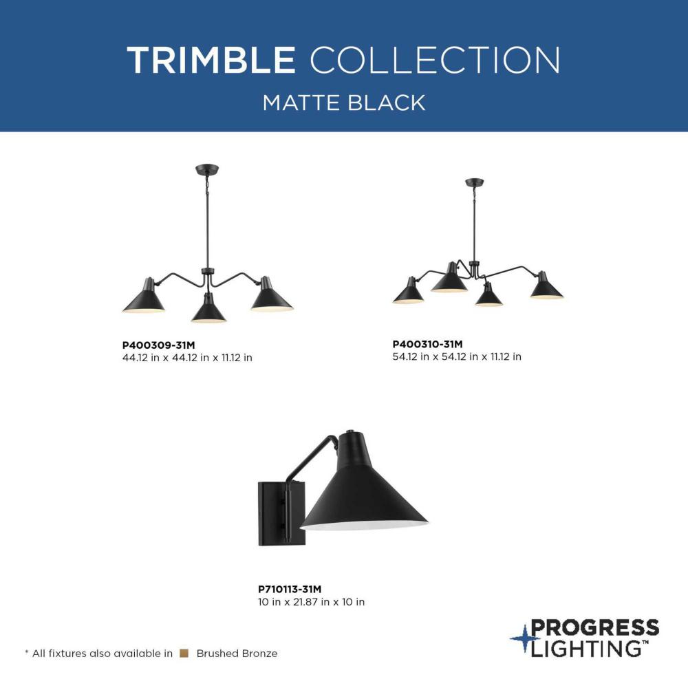An angular metal shade create a signature design statement in the Trimble Collection Wall Bracket. Its mid-century modern inspiration incorporates a streamlined approach and rich visual details that bring iconic style to open spaces. The opaque metal shade, arm and backplate are finished in classic matte black. This wall light is ideal for delivering crisp downlight to bedrooms and living rooms in mid-century modern and luxe industrial settings.