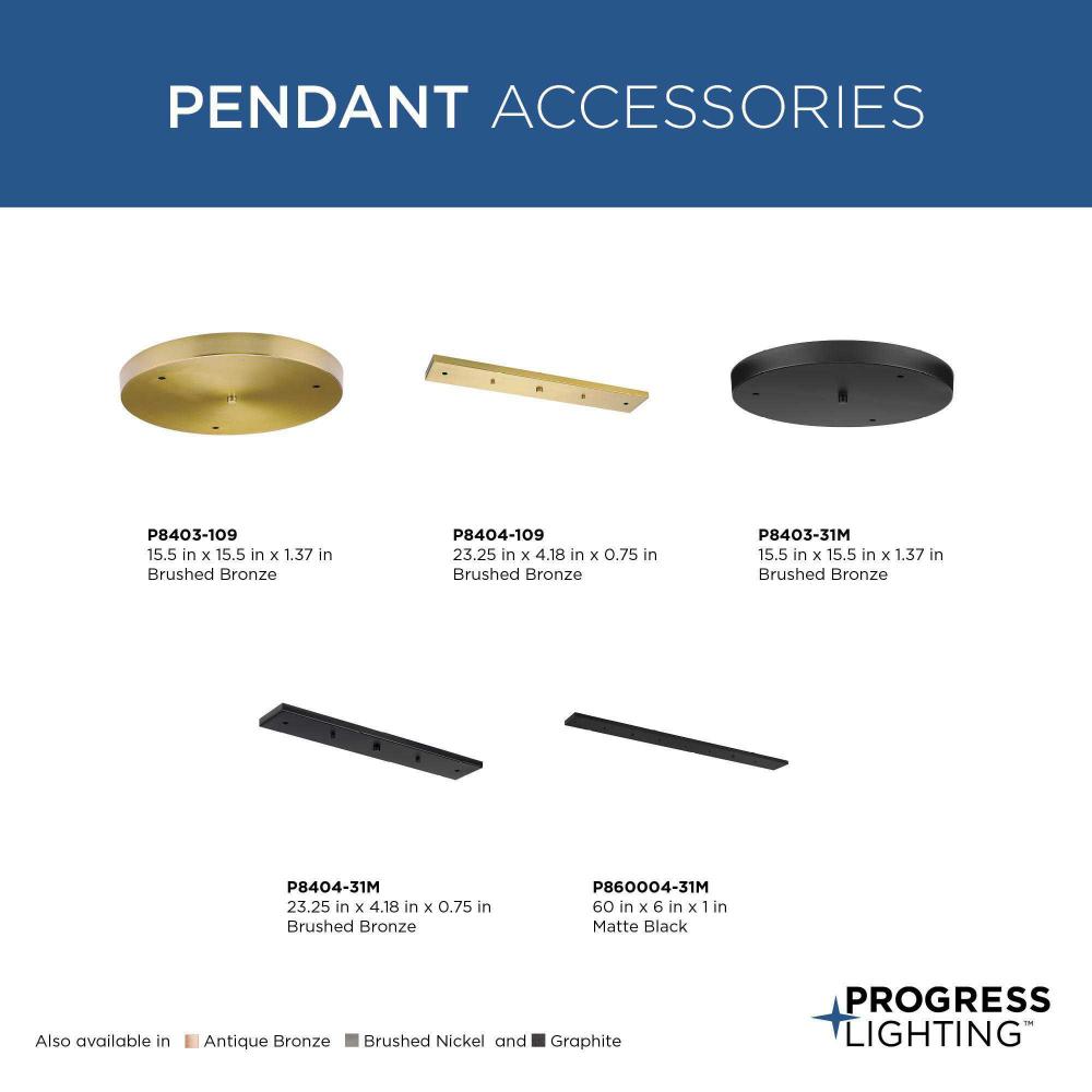 Progress Lighting's canopy accessory offers a convenient way to mount groupings of pendants. Pendants are versatile lighting options for many rooms in your home. Smaller-scale mini-pendants look great when hung in groupings of 3 or more over a kitchen island or table. This rectangular pendant accessory allows for the hanging of 2 or 3 pendants off of one outlet box. Pendants can be hung straight or staggered.