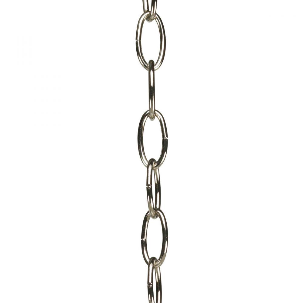 Polished Nickel finish.;Standard 3 o'clock cut, oval chain.;10 Ft. overall length - may be shortened as needed.;9 gauge, 50 lbs. maximum weight.