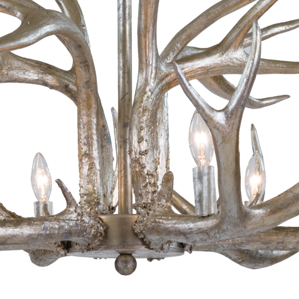 Wildlife gone glam. The resin Antler Chandelier wears a metallic Ambered Silver Leaf to bring a beautiful sheen to a modern, eclectic home. Hang in a living room for a ‘wow’ moment.