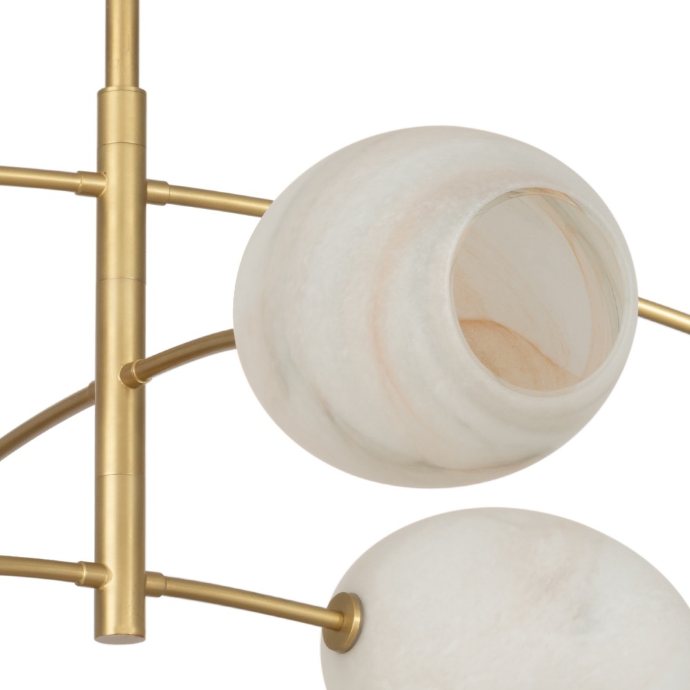 Artemis blends sleek design with the allure of artisan-crafted glass. Its open-ended Alabaster-like glass globes add moody sophistication, creating a captivating and unique ambiance. Inspired by the concept of a mobile, Artemis features gracefully balanced arches in a natural brass finish, making it both a functional light source and a stunning piece of modern art.