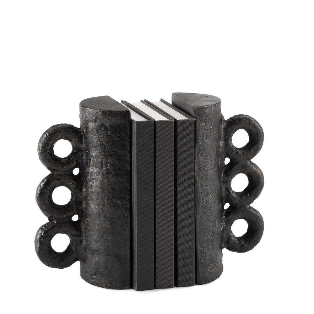 Elevate your decor with the Chandra Bookends, featuring a unique, textured surface inspired by traditional paper mache techniques. Finished in a refined matte brown/grey, these bookends highlight the beauty of handcrafted design. Their artisanal charm and natural elegance make them a perfect addition to any bookshelf or desk, adding a touch of Boho-chic style and sophistication to your eclectic living space.