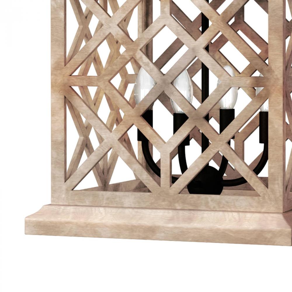 A beautiful lattice pattern emerges from solid wood to create the Chatham Wood Lantern’s signature coastal appeal. Blackened Iron components add a stately touch and the piece takes on a different feel when warmly lit, creating romantic light play within and on surrounding surfaces. Place this coastal beauty in an entryway, living room, or above a kitchen island or table.
