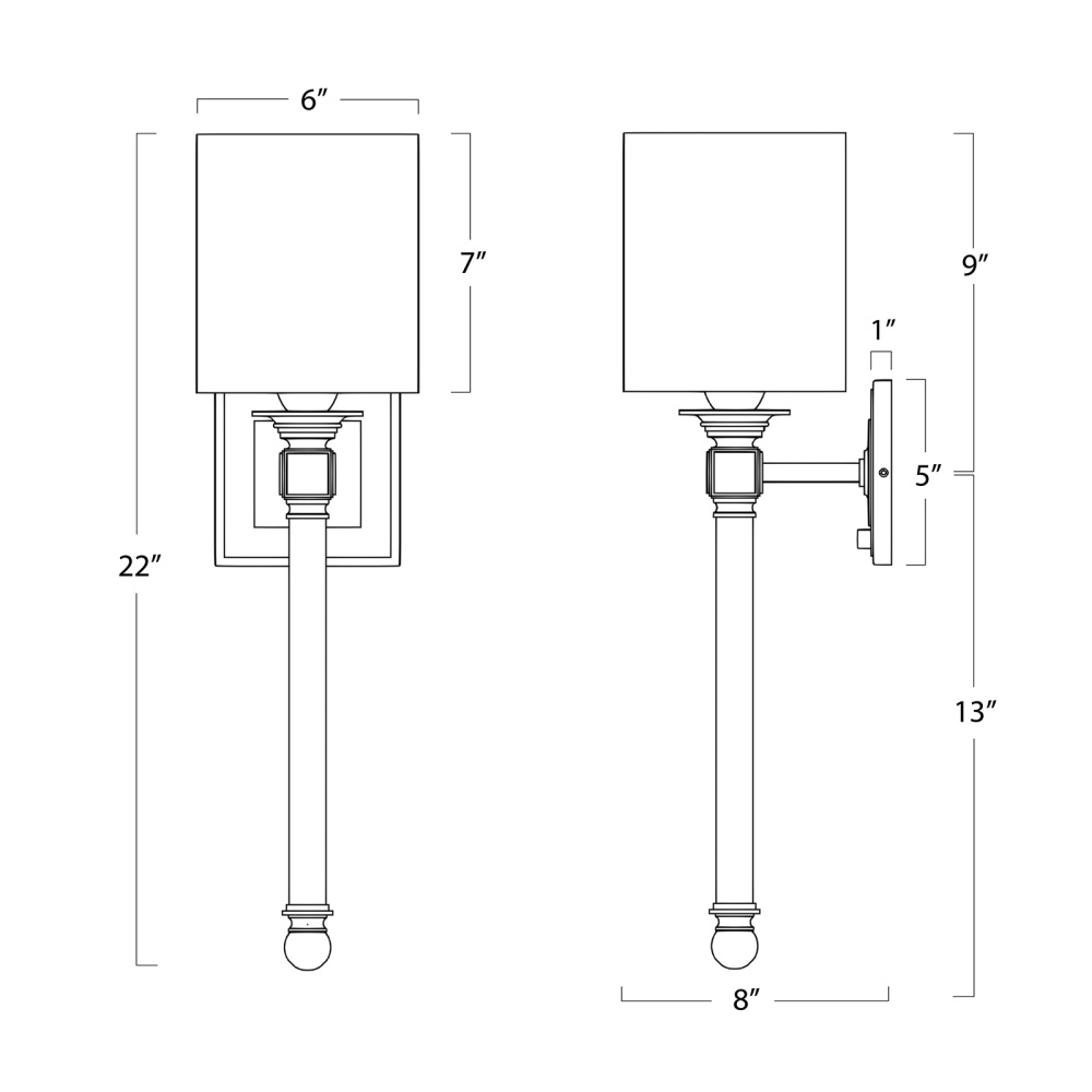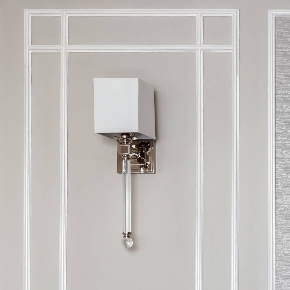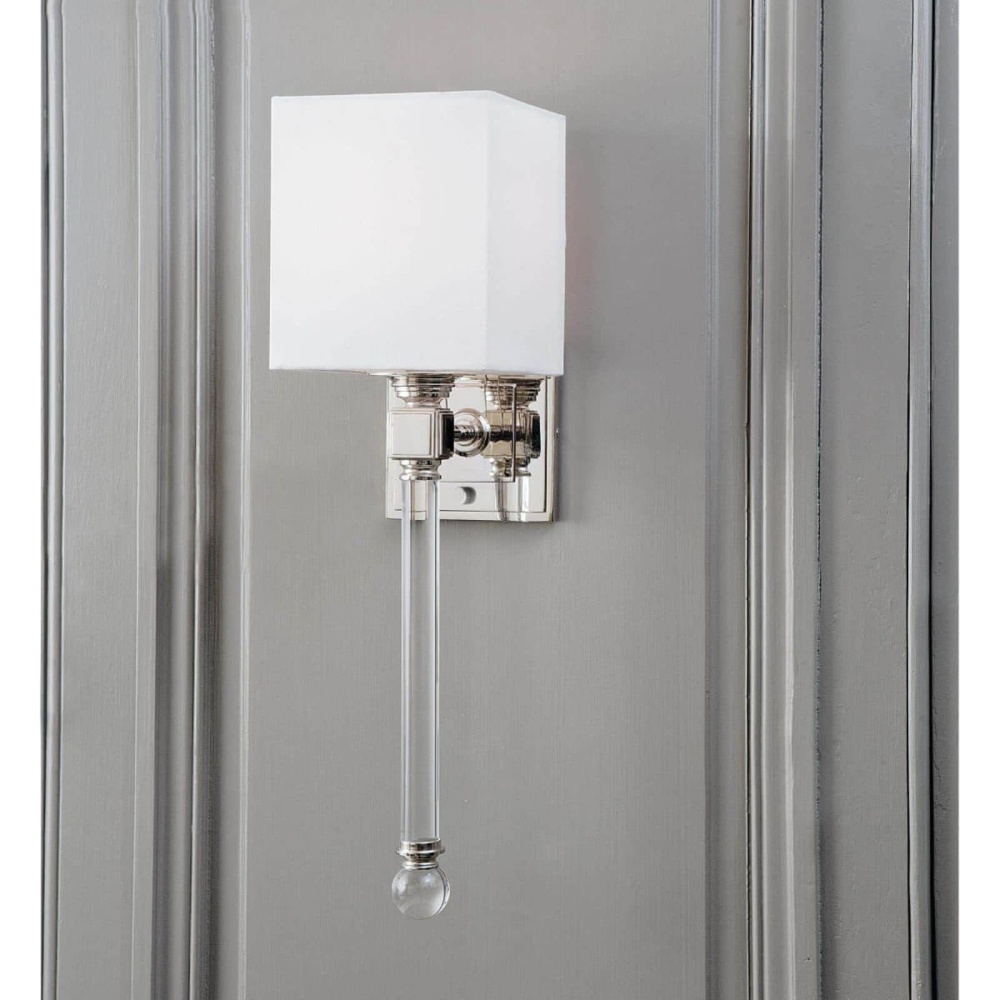 The modern silhouette and suspended cut crystal stem with clear ball finial of this sleek sconce emote luxurious style. A natural linen cube shade completes the classic look.