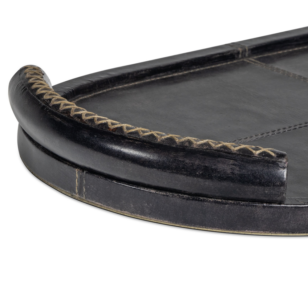 A handsome, black leather statement piece featuring intricate baseball stitching on the platform and lace stitching on the oversized handles. Its oval shape and weathered finish translate into a piece that lacks pretension, but emanates comfort and familiarity.